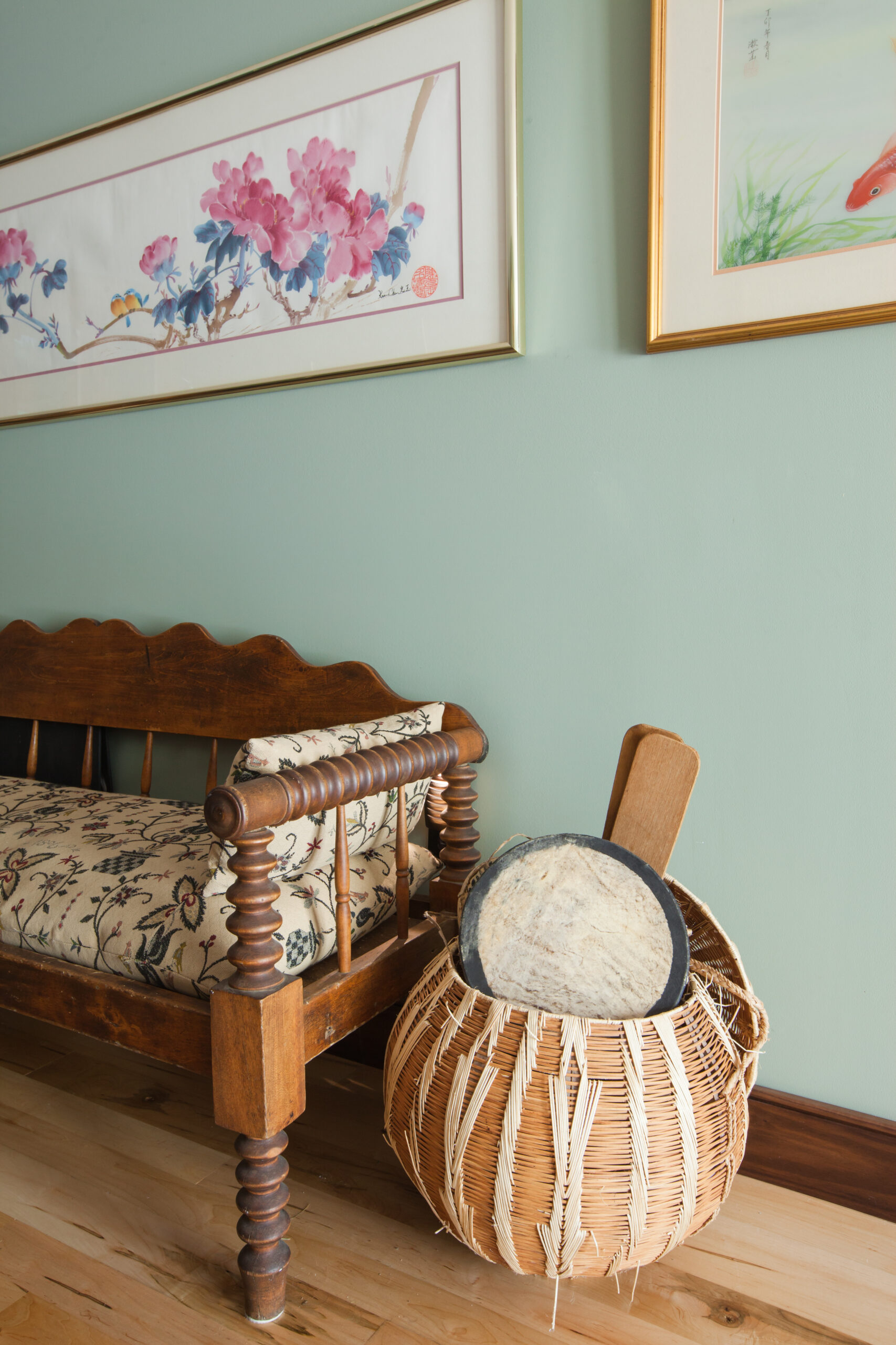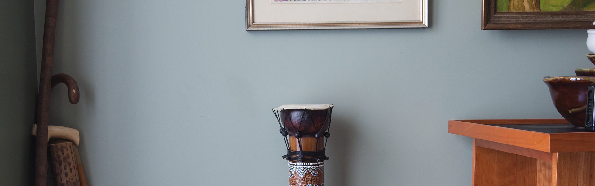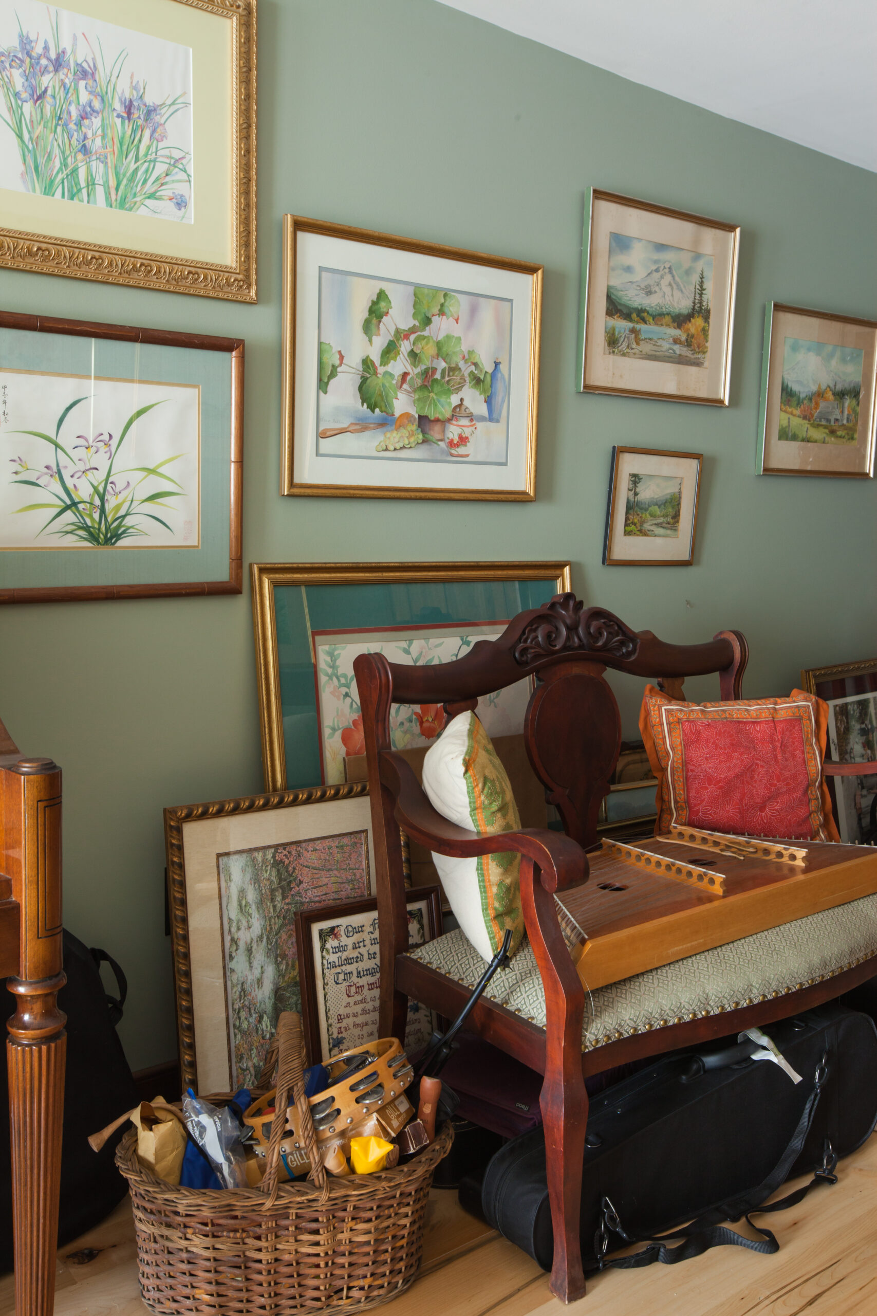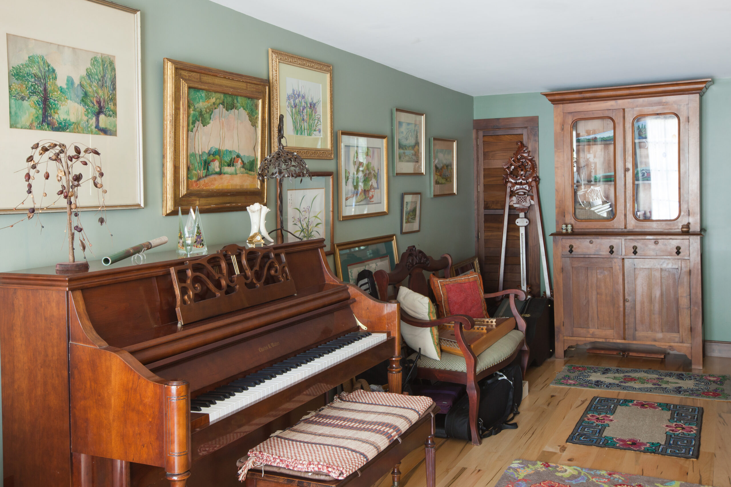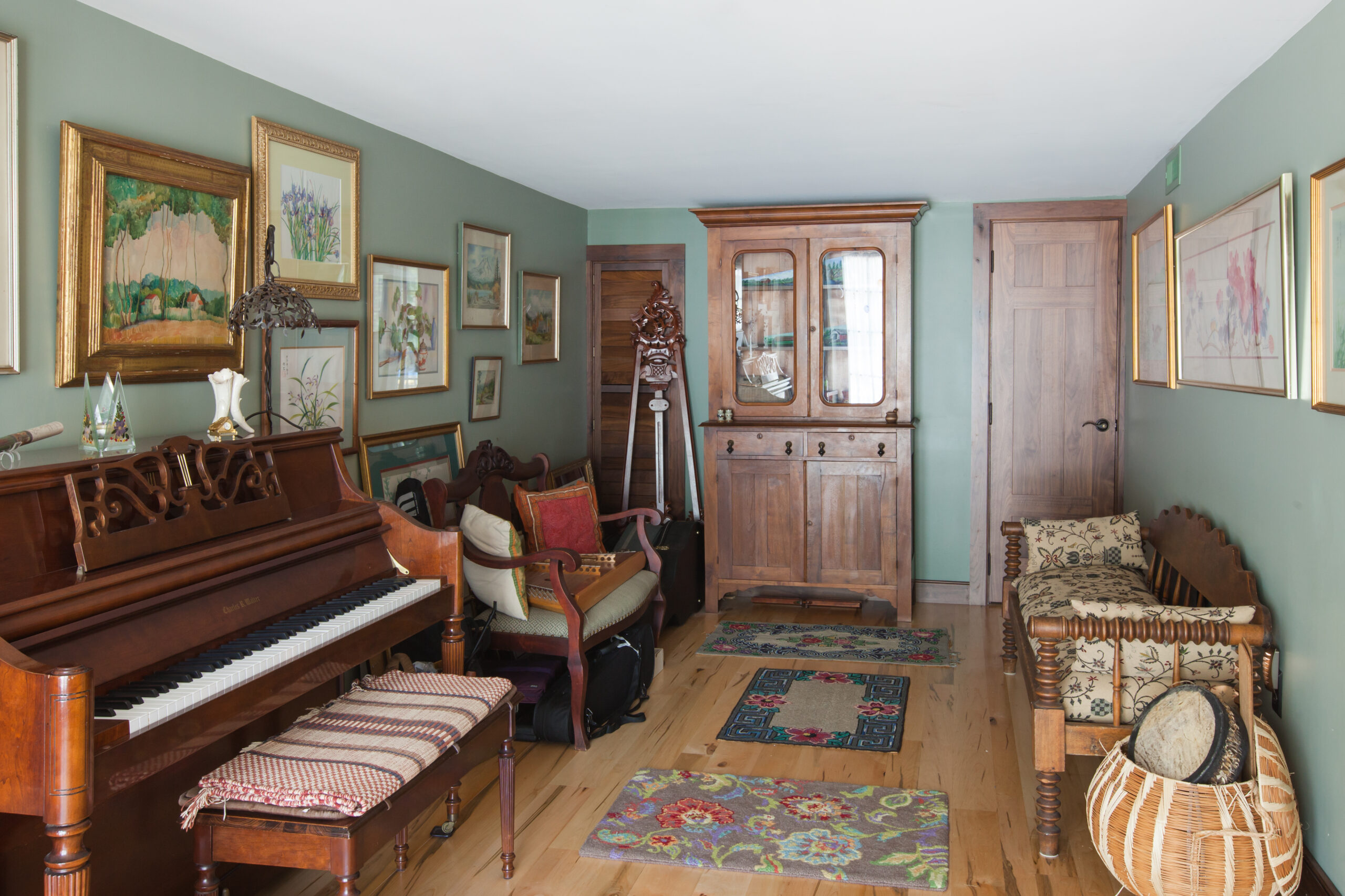 Enjoy our cozy art gallery room, complete with beautiful paintings, antiques, and an eclectic instrument collection. Our piano and instruments are free to play for all our guests.