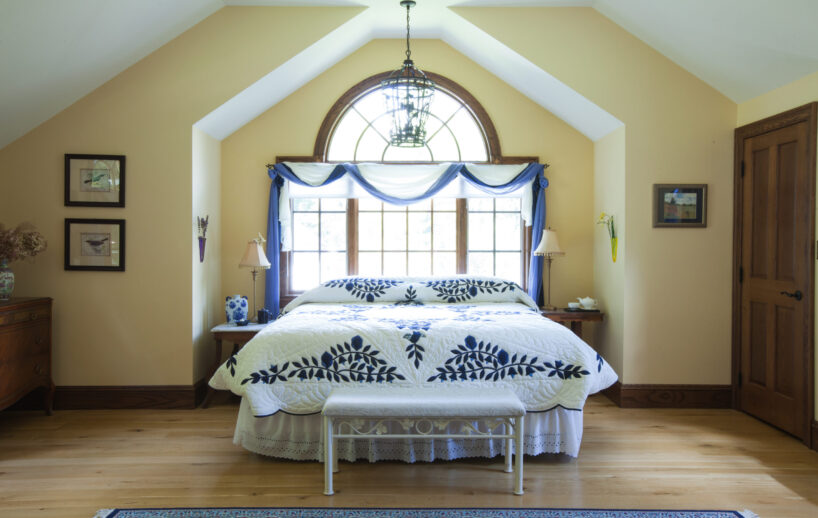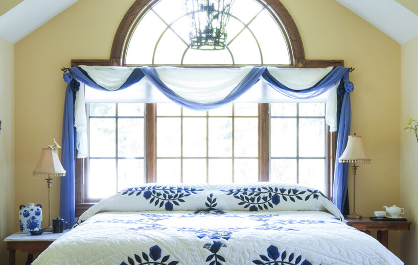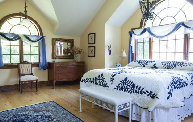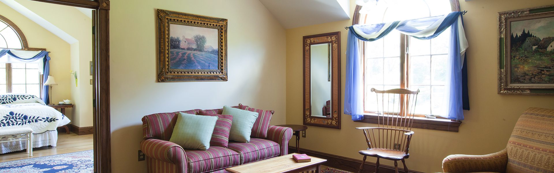 The Secret Garden Suite is a two-room suite that includes a cozy living room with 10-foot ceilings, a private bathroom with a large claw-foot tub, separate shower, double bowl sink with ornate mirror, and a separate toilet room. The bedroom features a king-size bed with a beautiful appliquéd Amish quilt, and four circle-top windows provide natural light throughout the space.