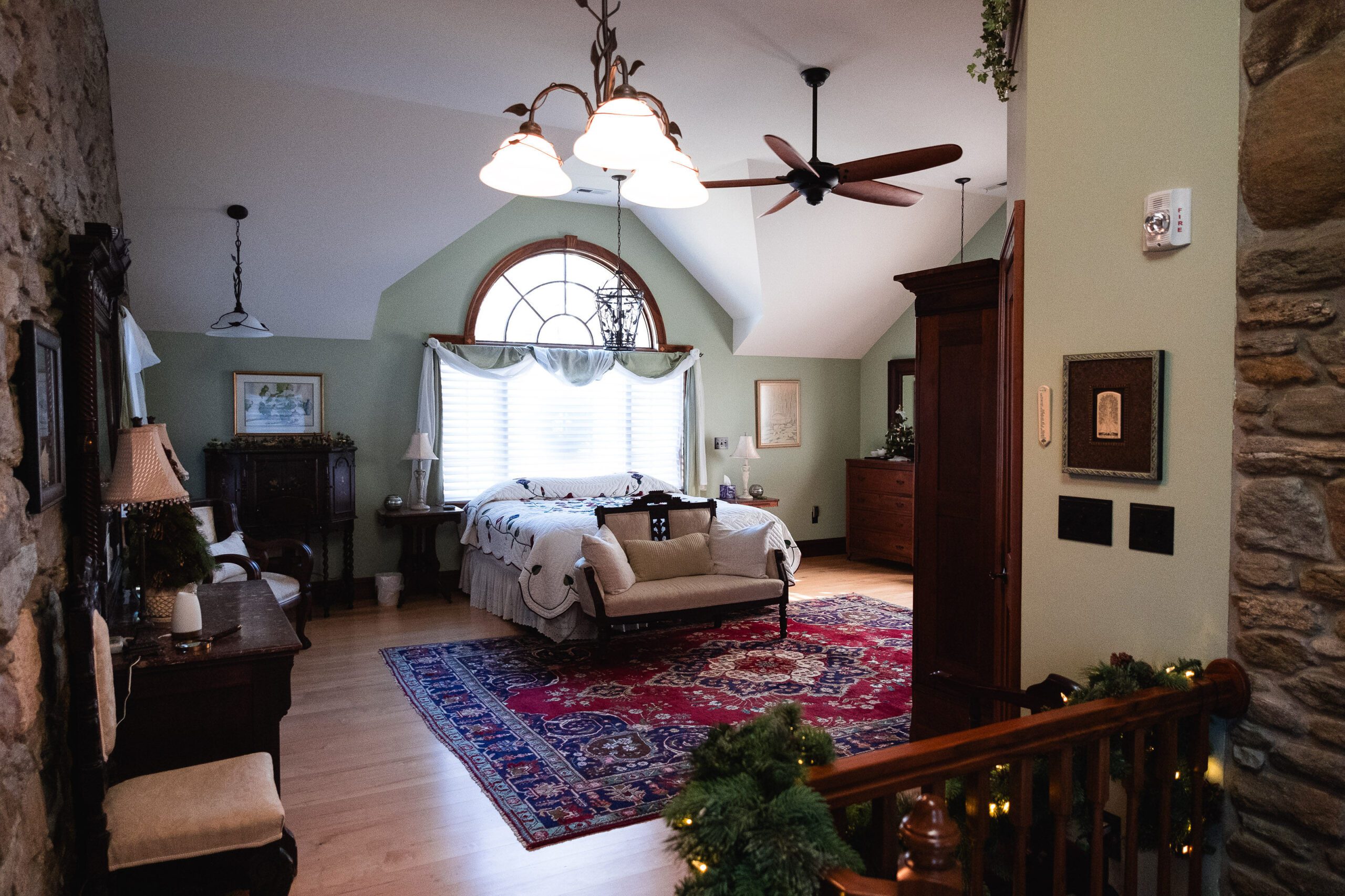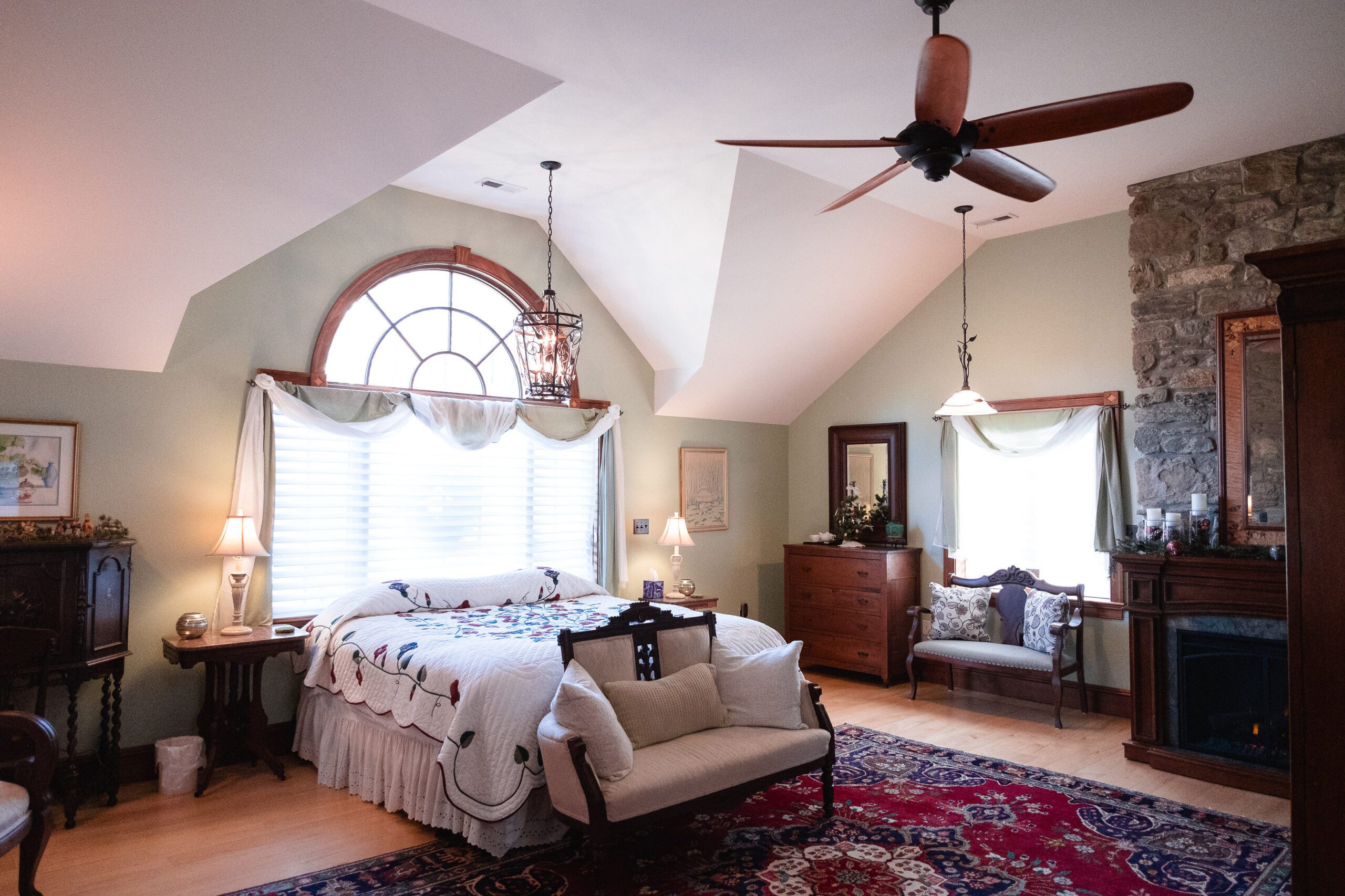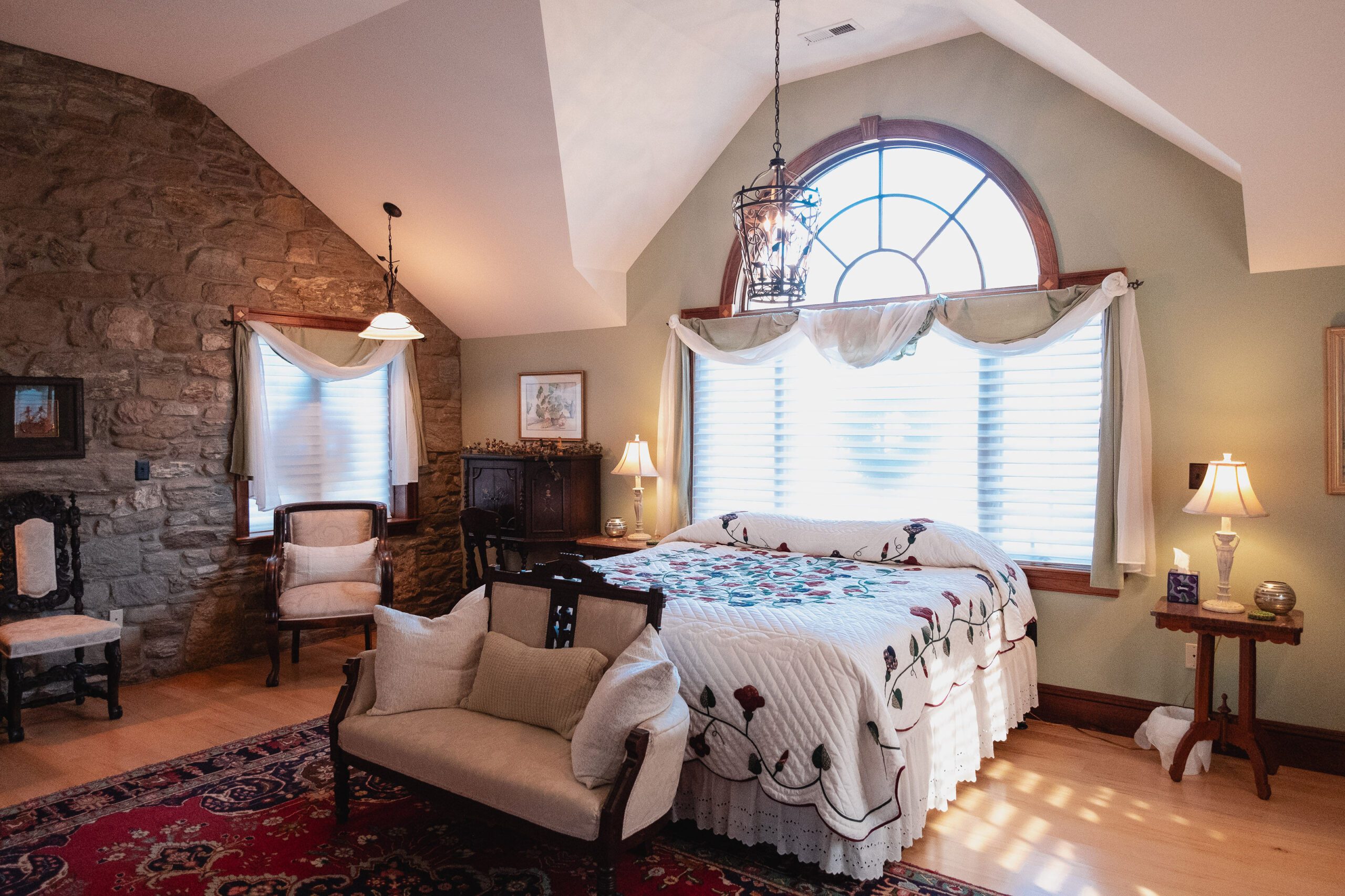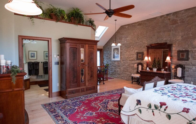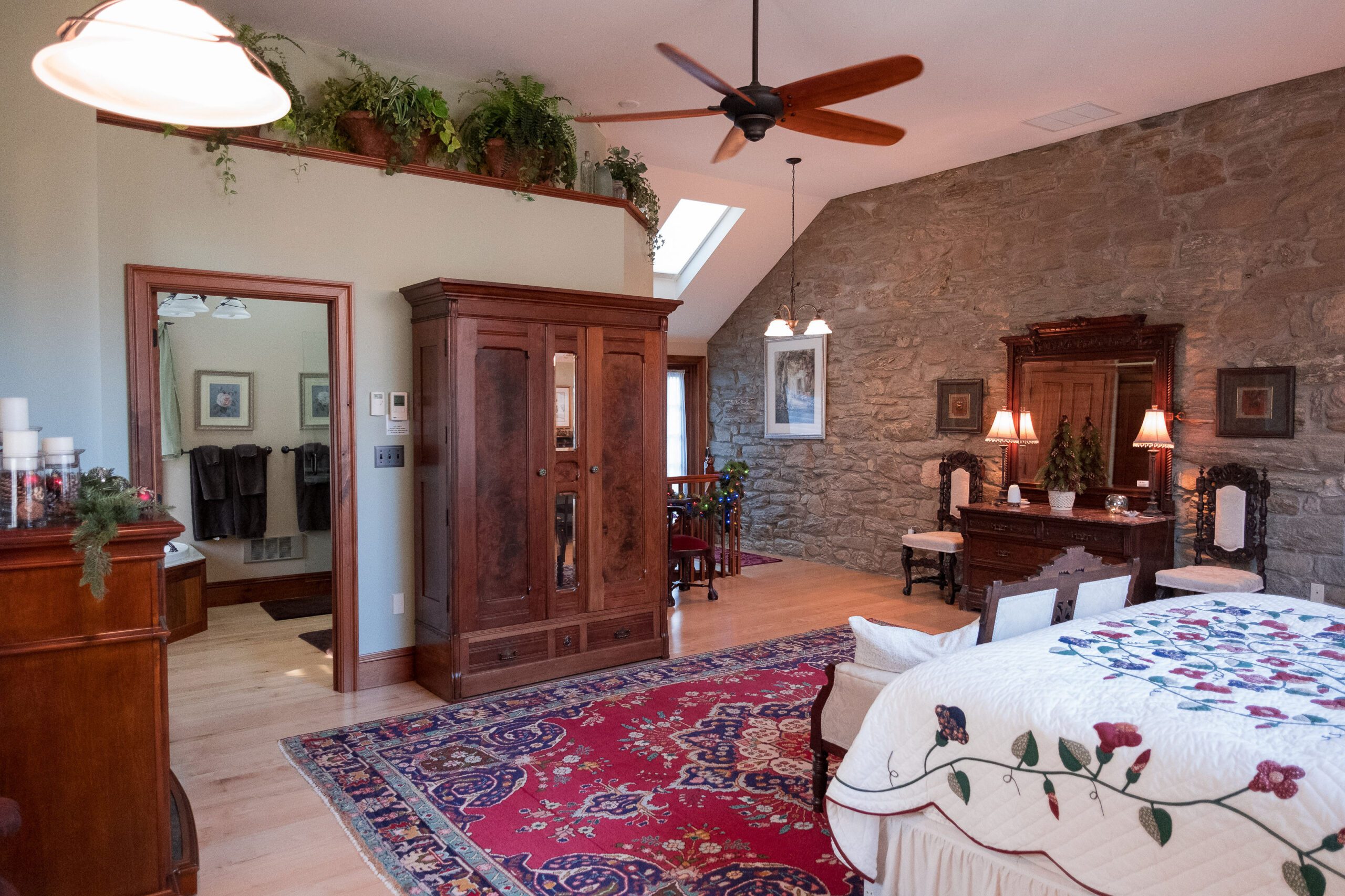 The Suite on the Pond features a king-size bed adorned with a beautiful Amish hand-quilted bedspread and includes a whirlpool tub for two, surrounded by windows with views of the pond, stream, and upper gardens. A custom-built spiral staircase leads to the room, which boasts figured maple flooring, walnut woodwork, and a separate custom tile shower. The bathroom is equipped with a double bowl vanity.