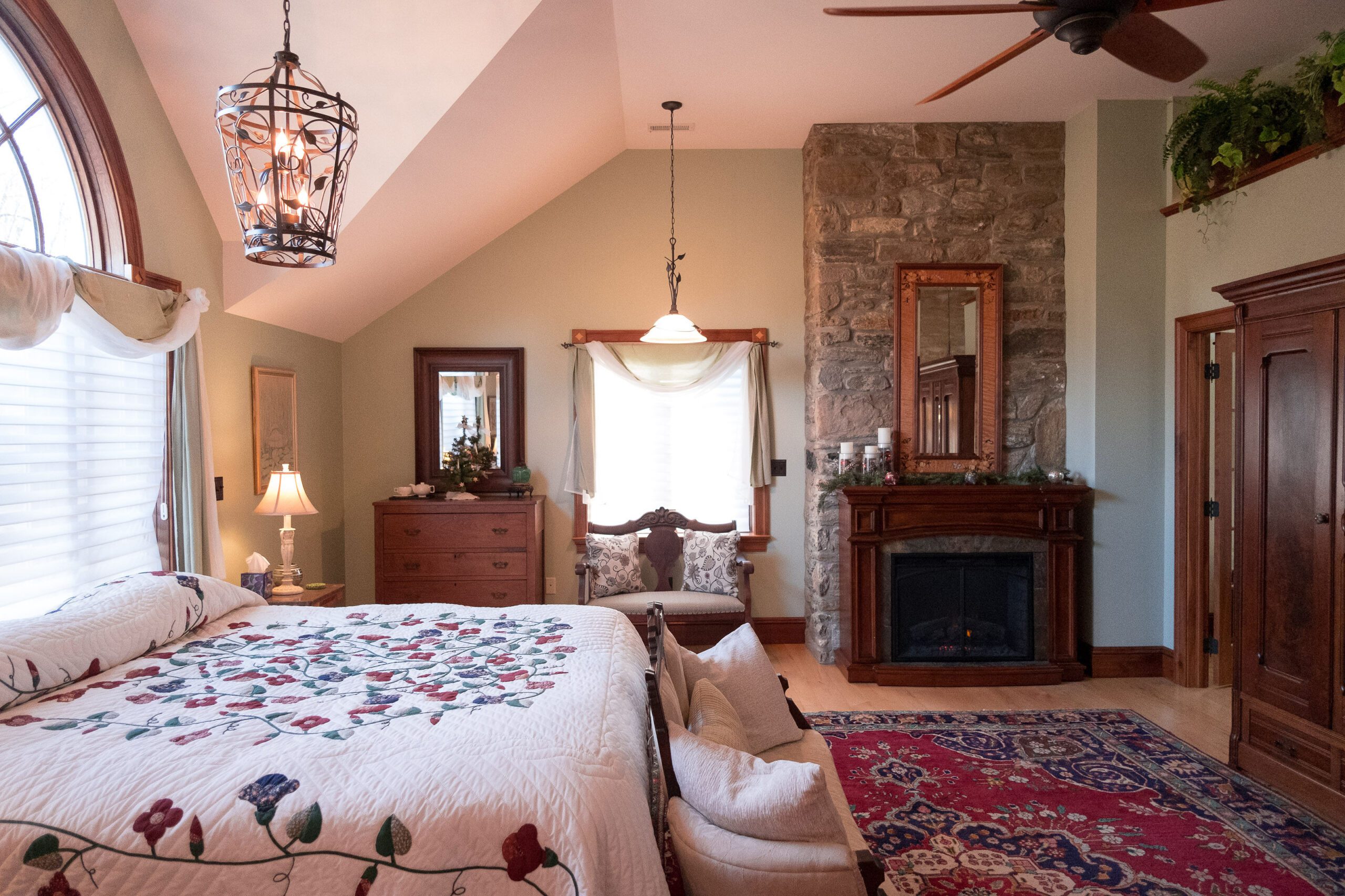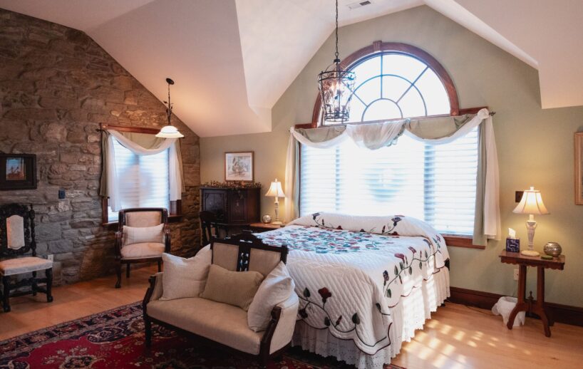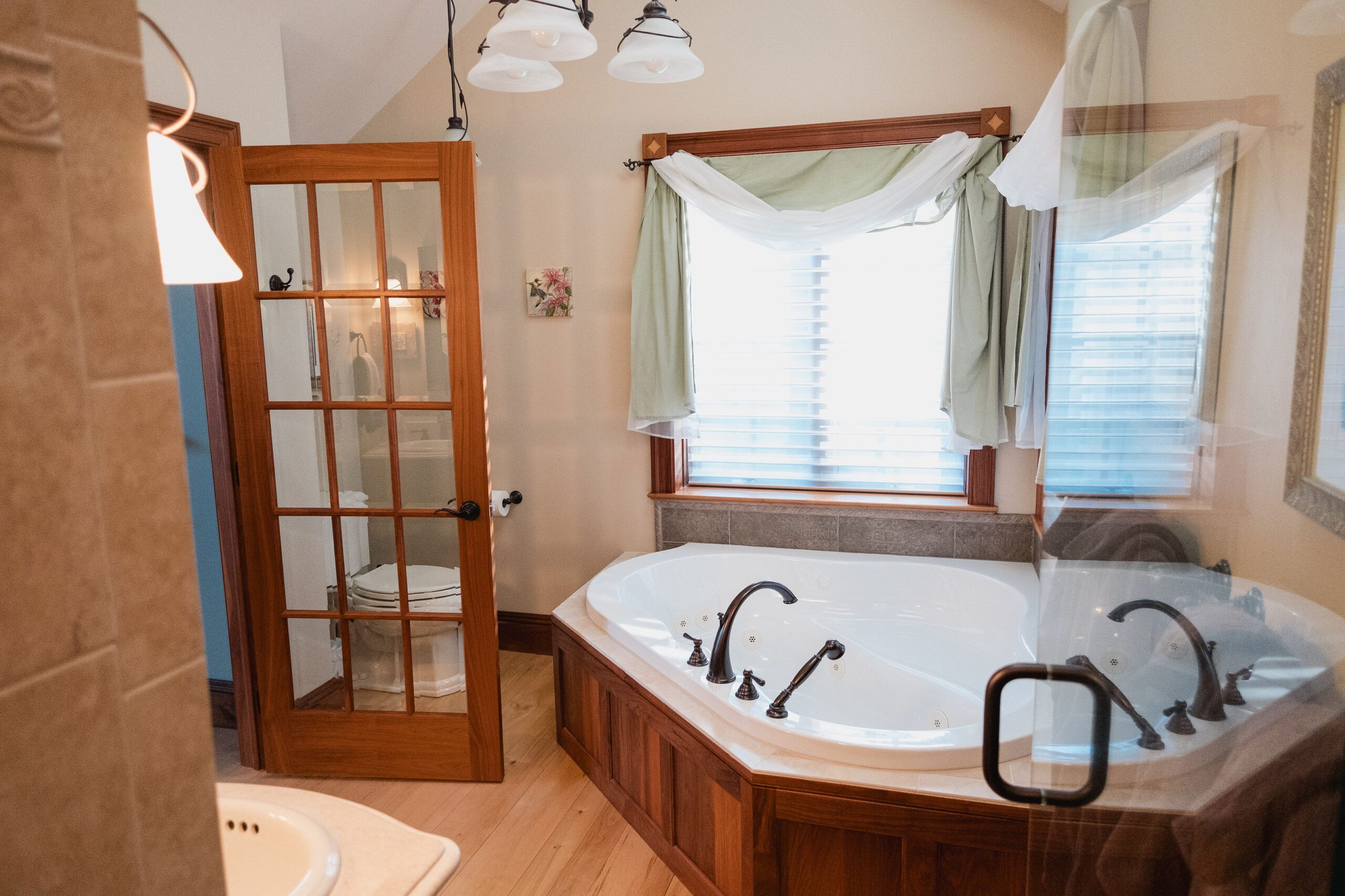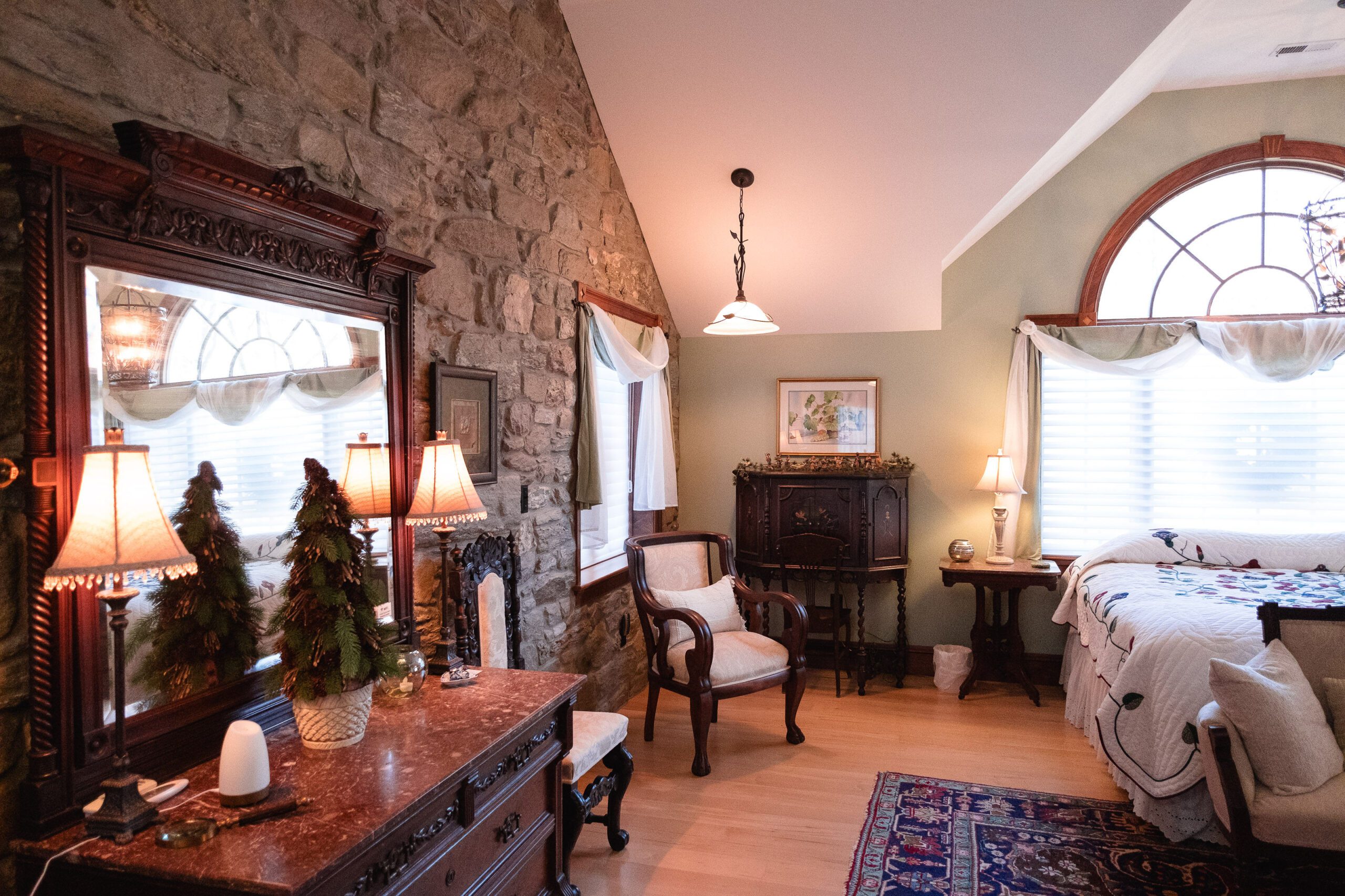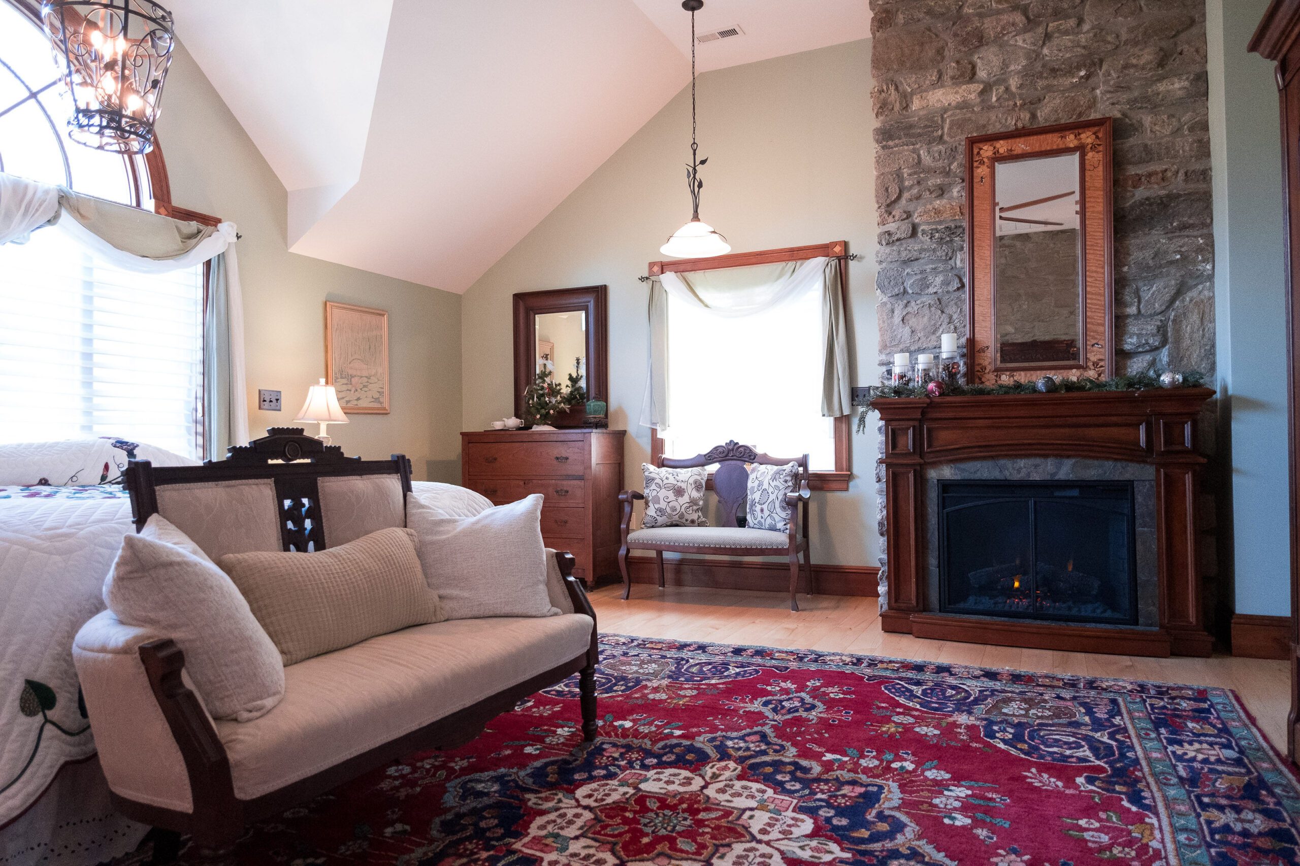 The Suite on the Pond features a king-size bed adorned with a beautiful Amish hand-quilted bedspread and includes a whirlpool tub for two, surrounded by windows with views of the pond, stream, and upper gardens. A custom-built spiral staircase leads to the room, which boasts figured maple flooring, walnut woodwork, and a separate custom tile shower. The bathroom is equipped with a double bowl vanity.