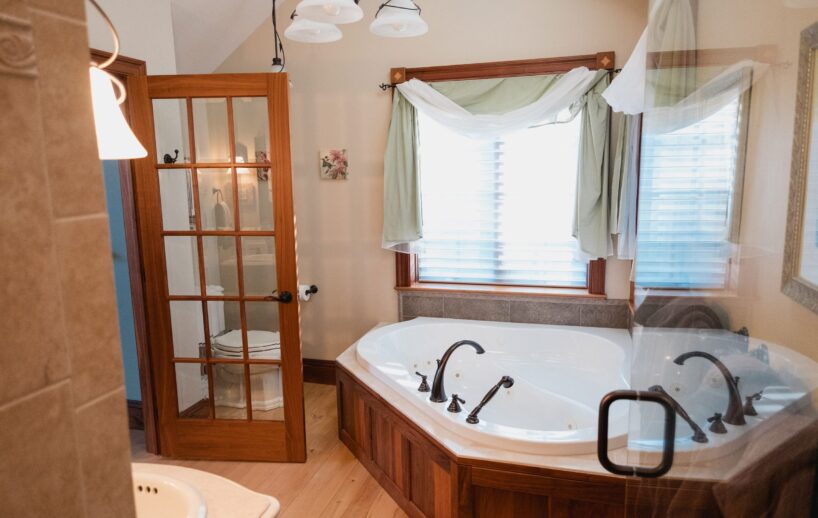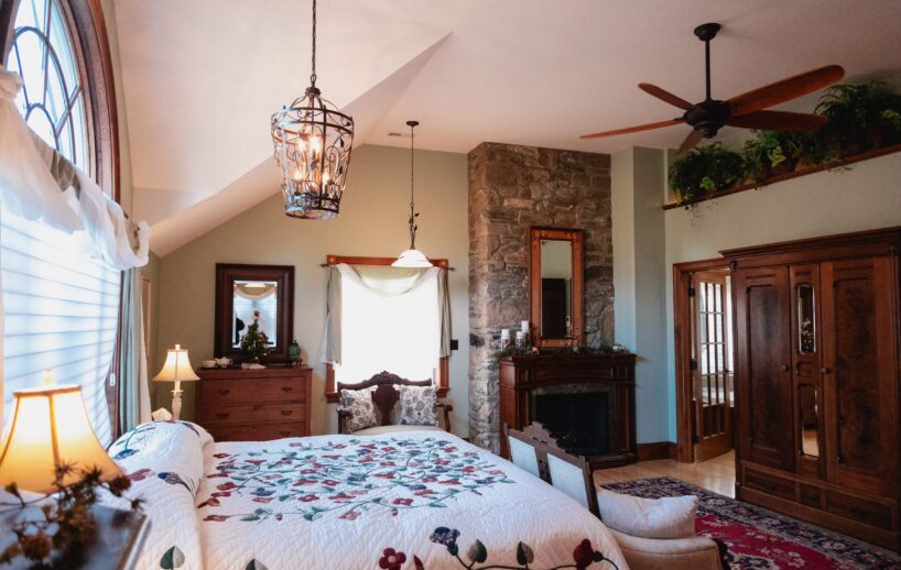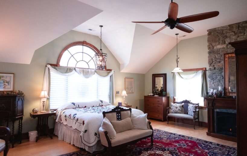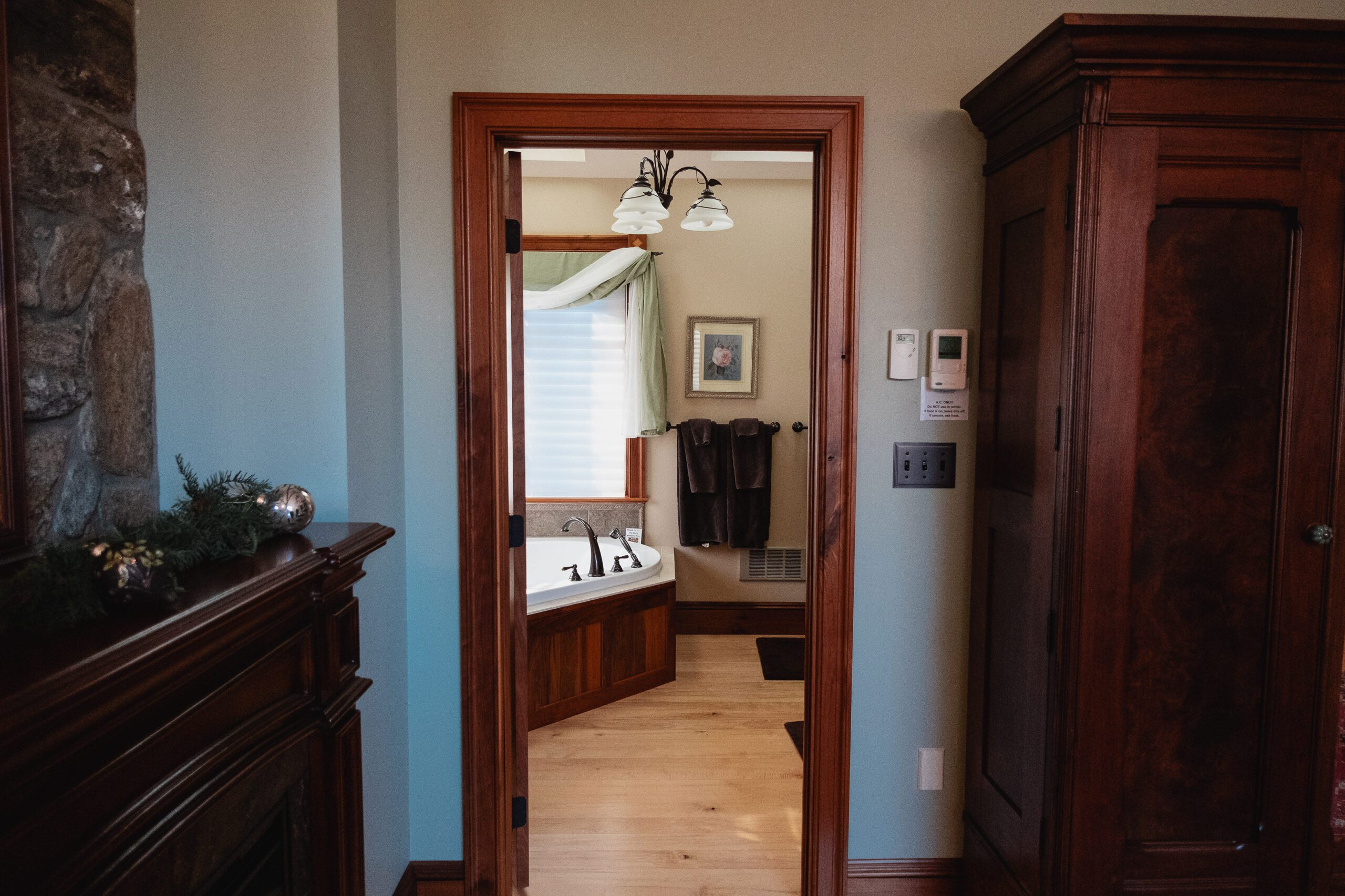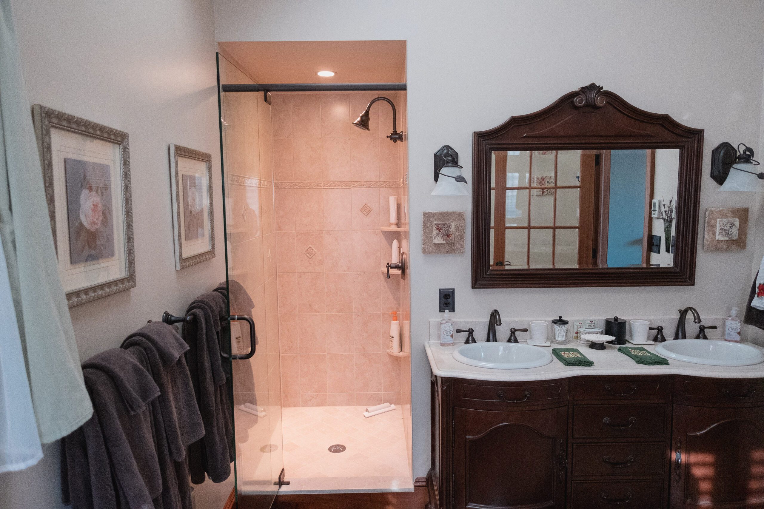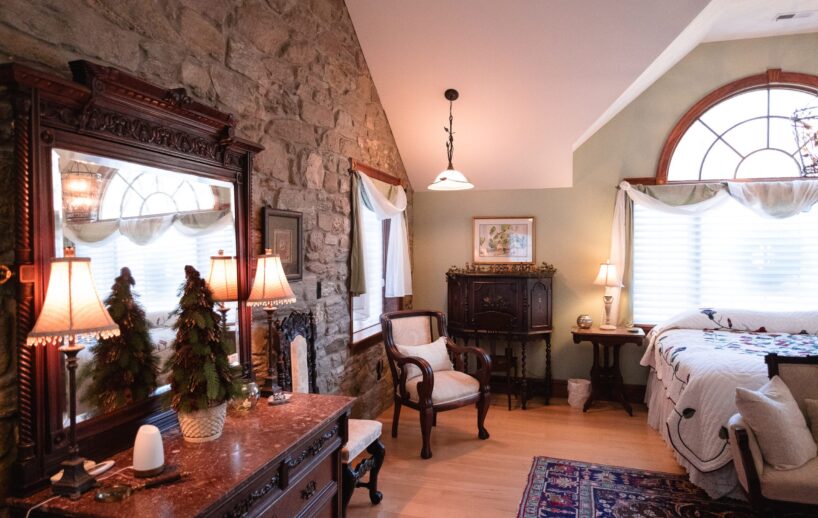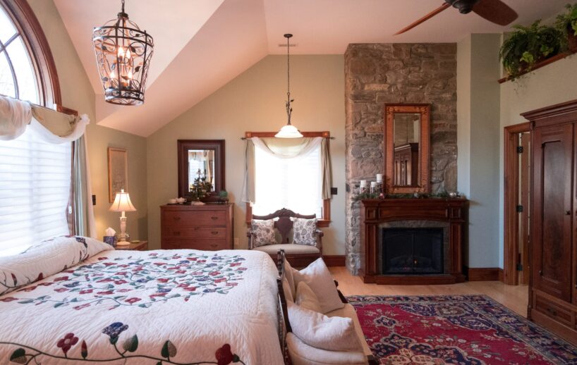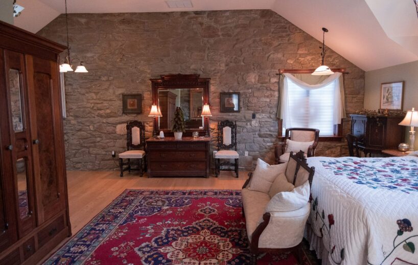 The Suite on the Pond features a king-size bed adorned with a beautiful Amish hand-quilted bedspread and includes a whirlpool tub for two, surrounded by windows with views of the pond, stream, and upper gardens. A custom-built spiral staircase leads to the room, which boasts figured maple flooring, walnut woodwork, and a separate custom tile shower. The bathroom is equipped with a double bowl vanity.