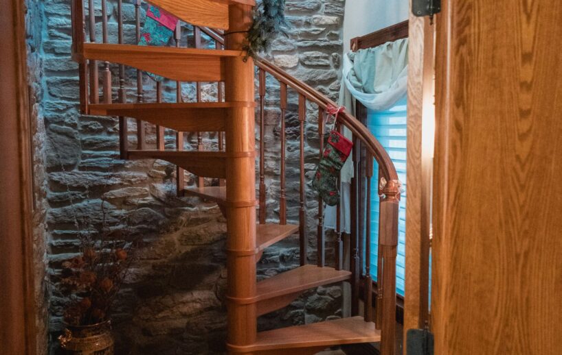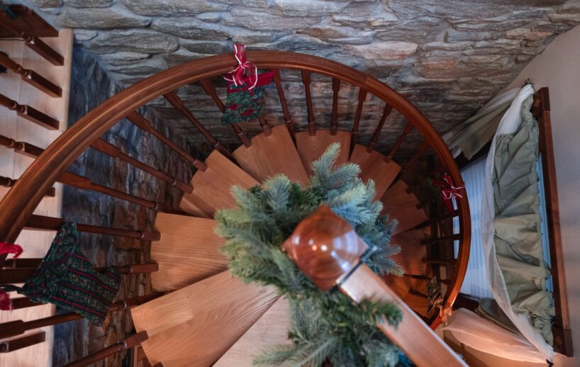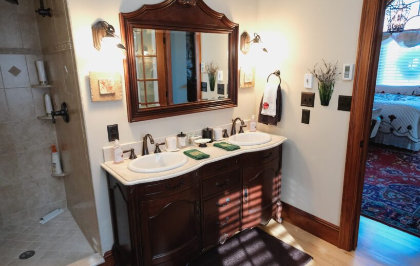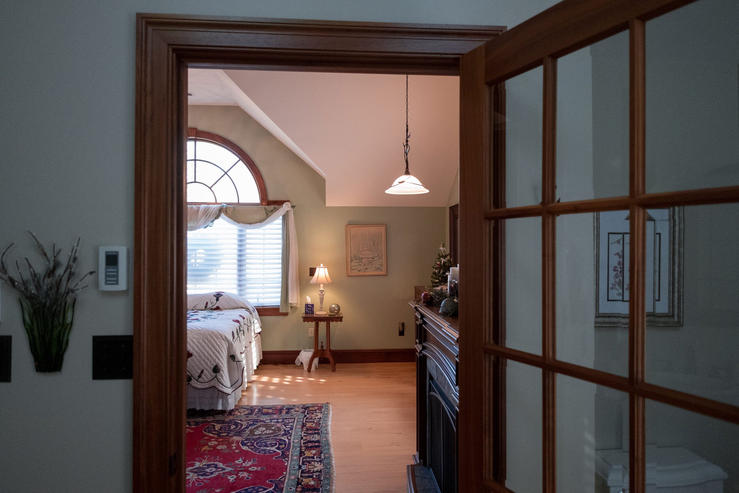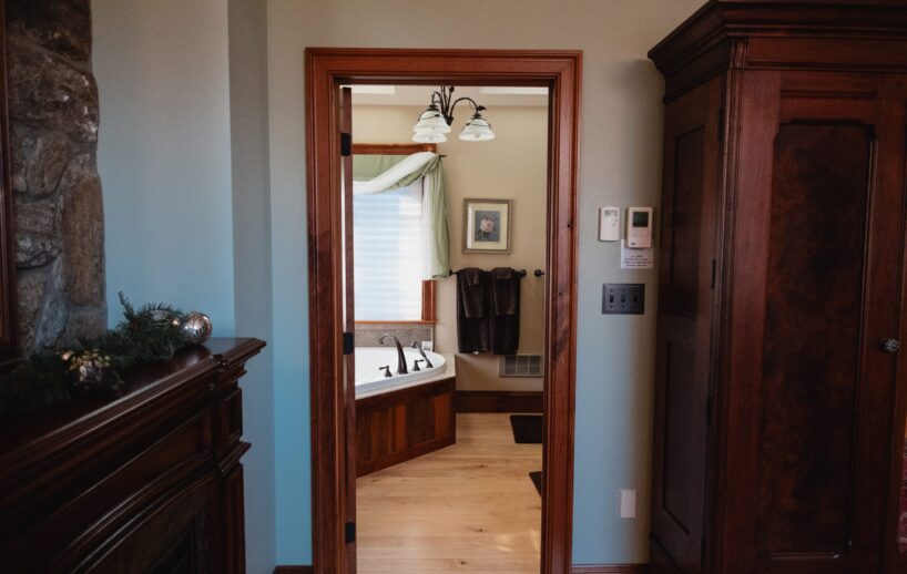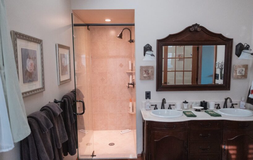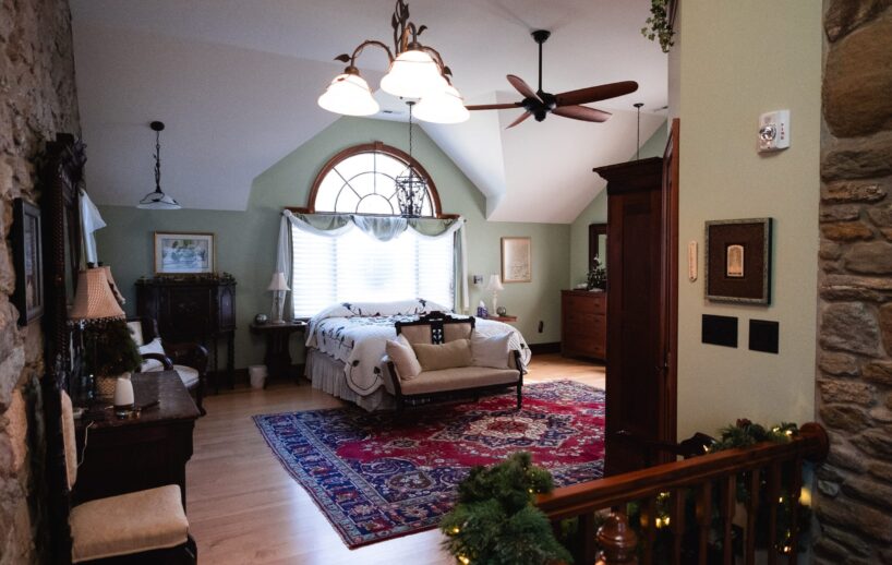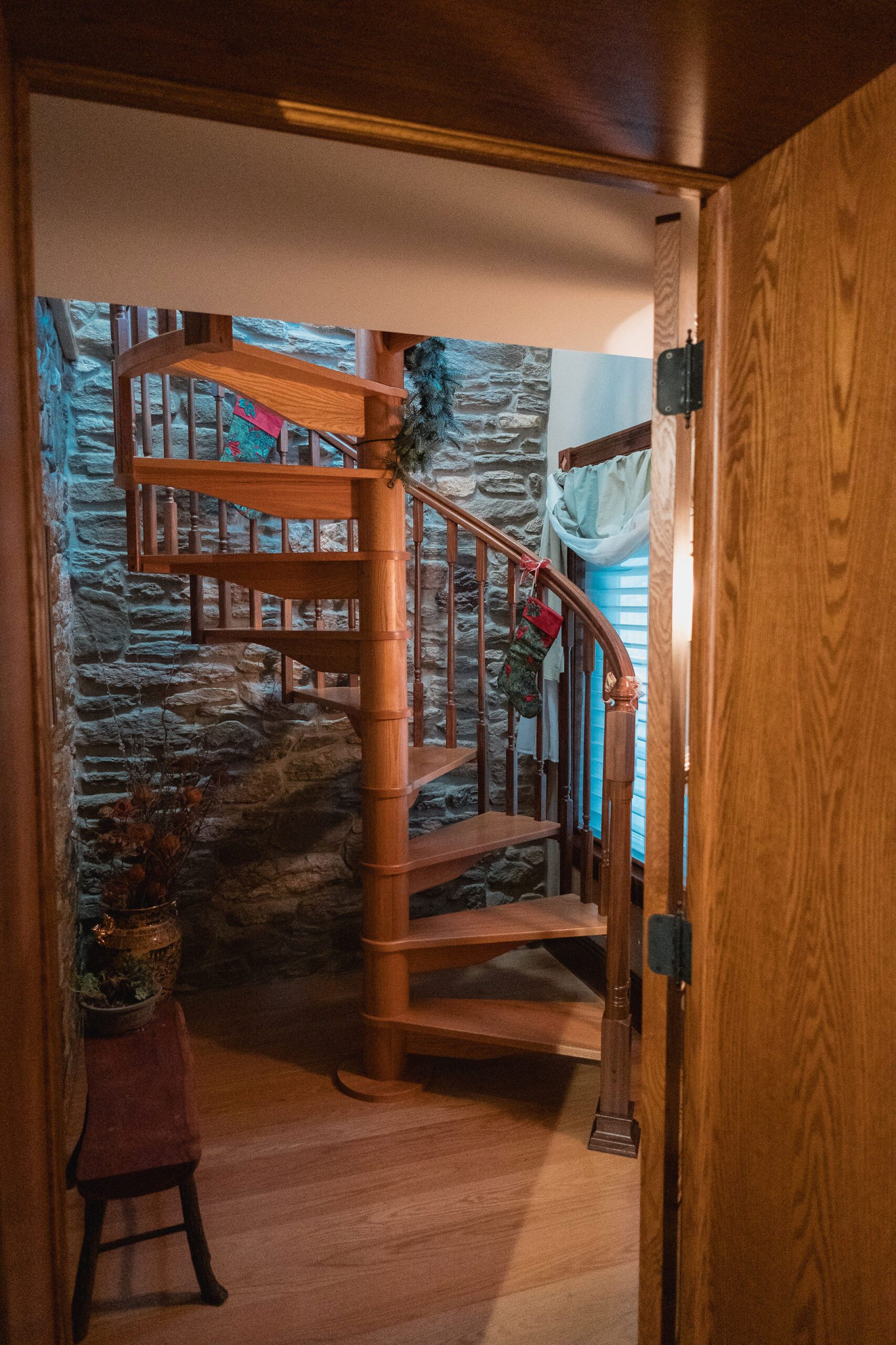 The Suite on the Pond features a king-size bed adorned with a beautiful Amish hand-quilted bedspread and includes a whirlpool tub for two, surrounded by windows with views of the pond, stream, and upper gardens. A custom-built spiral staircase leads to the room, which boasts figured maple flooring, walnut woodwork, and a separate custom tile shower. The bathroom is equipped with a double bowl vanity.