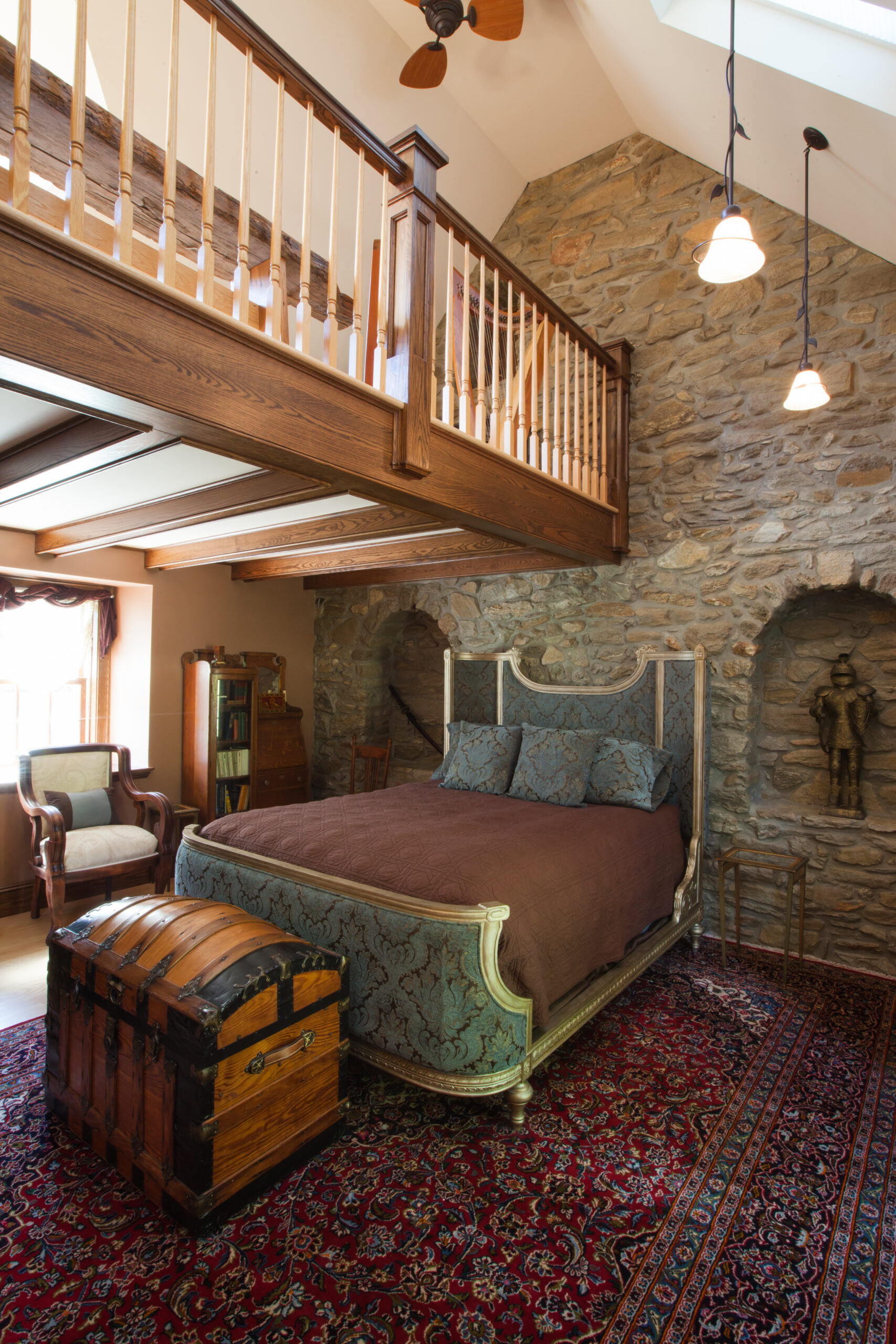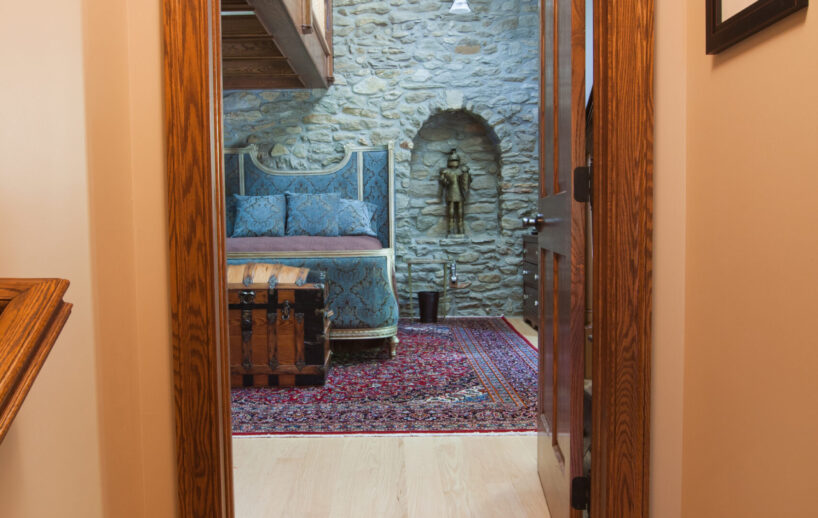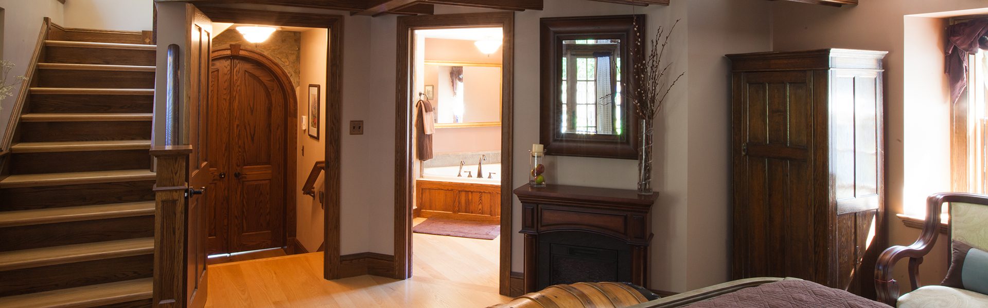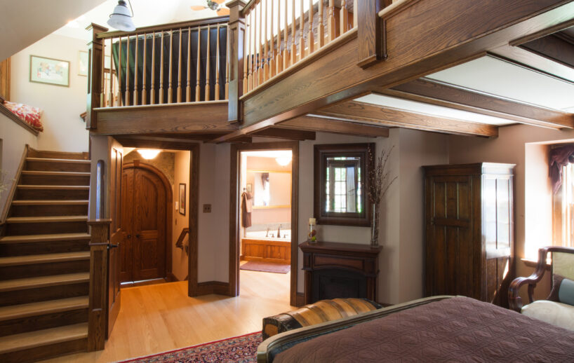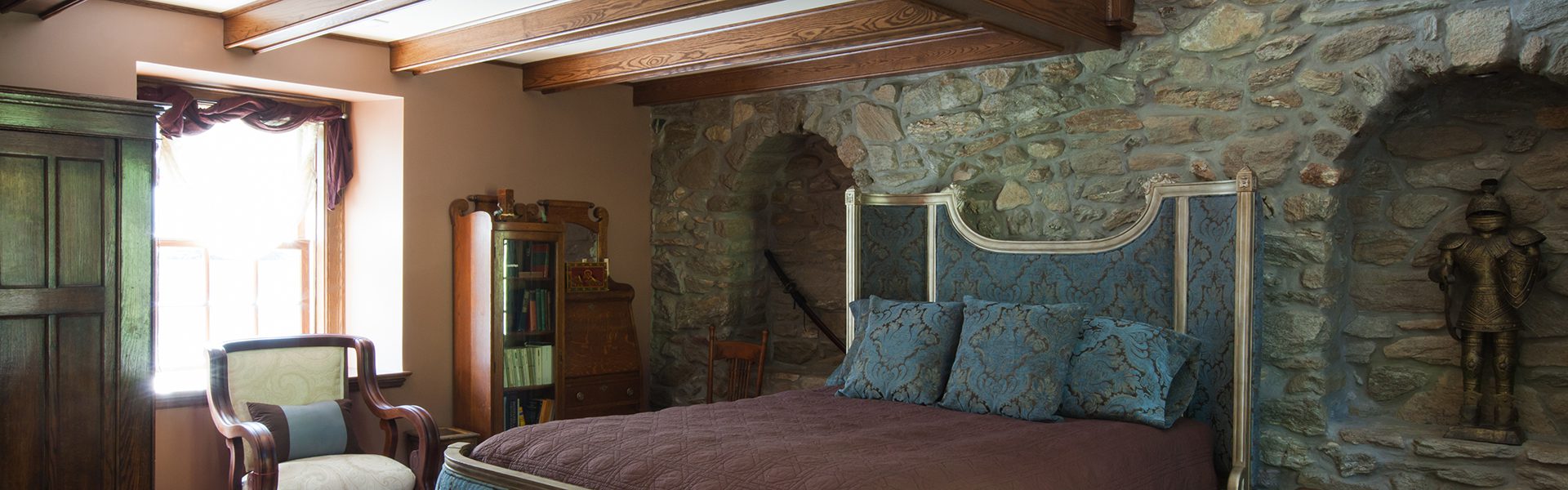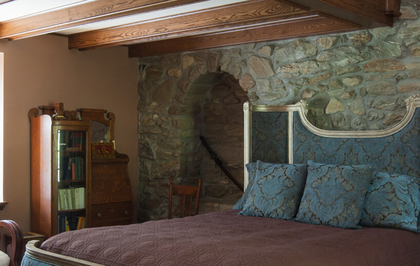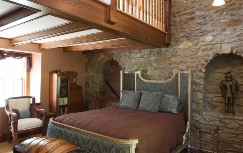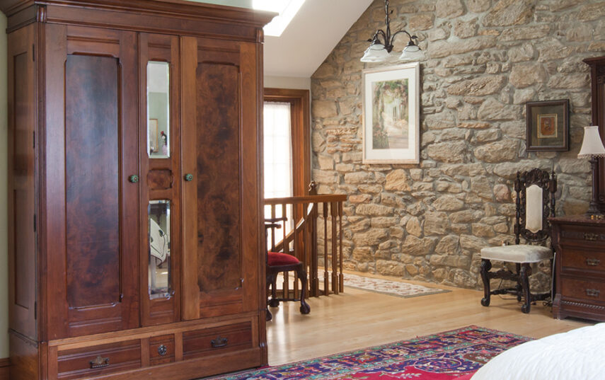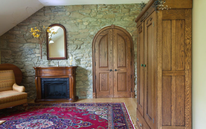 The Windows on the Stream Suite is a double room suite that features a loft bedroom with a Queen size bed and vaulted ceilings, main floor bedroom with a Queen size bed, alcoves, an interior stone wall, and large cozy window seats overlooking the millrace, stream, and upper gardens. The space includes red oak flooring, custom woodwork, couches, and a fireplace. The bedroom offers a hand-carved French Provincial queen-size bed, a wardrobe closet, and an original oriental carpet.