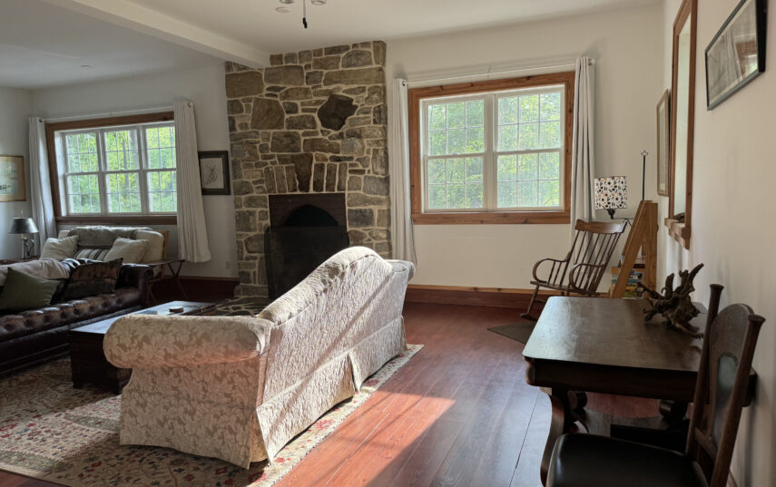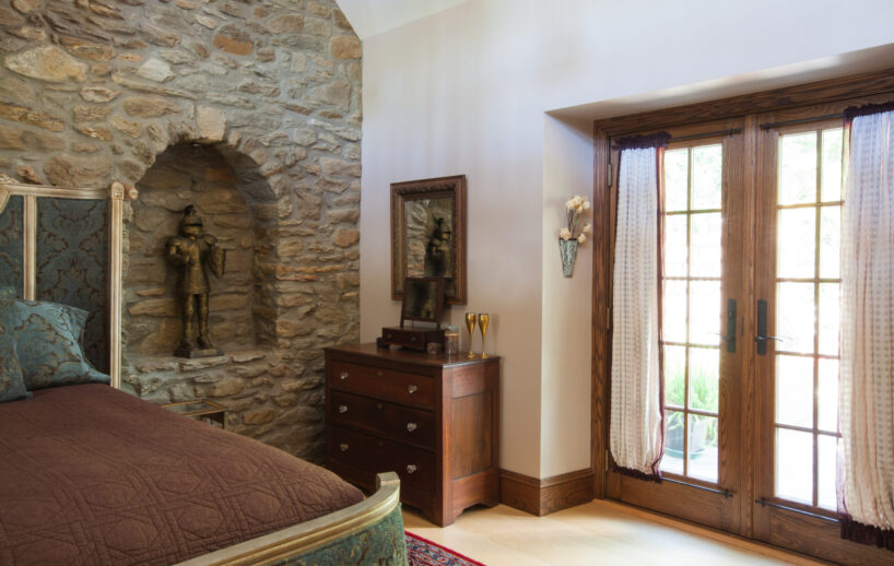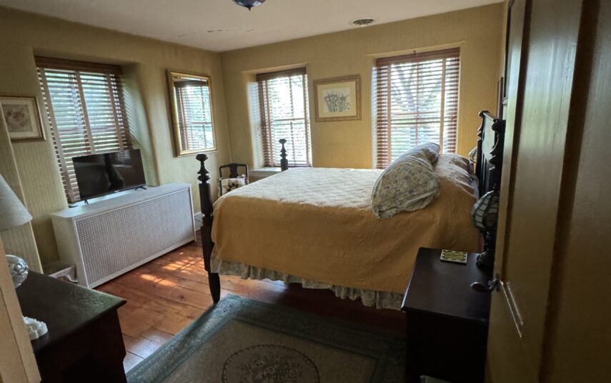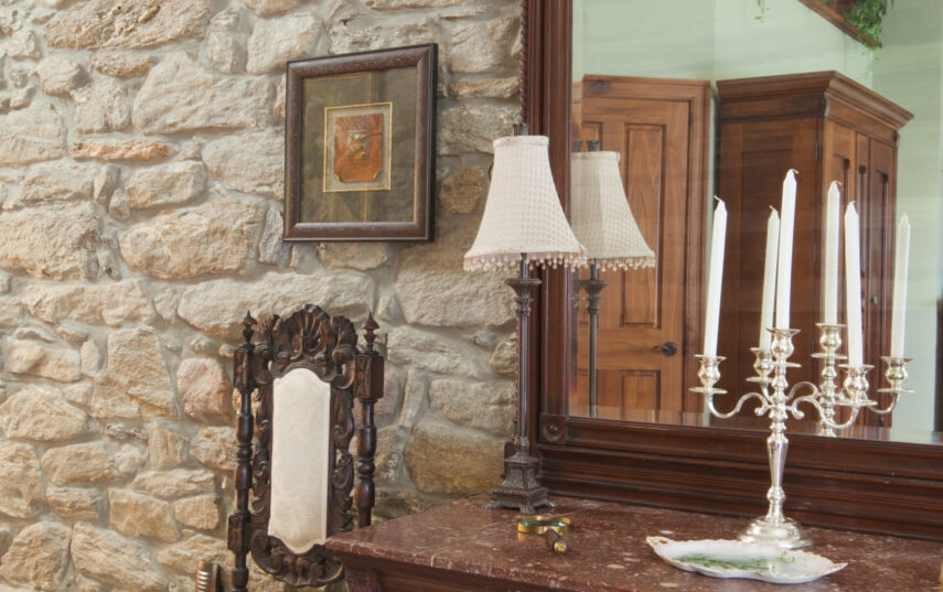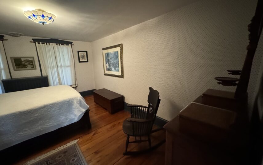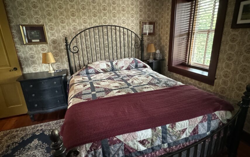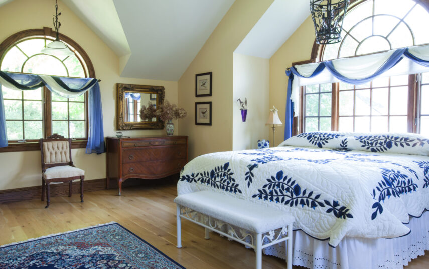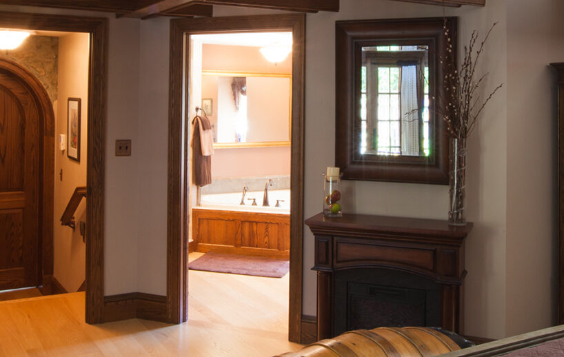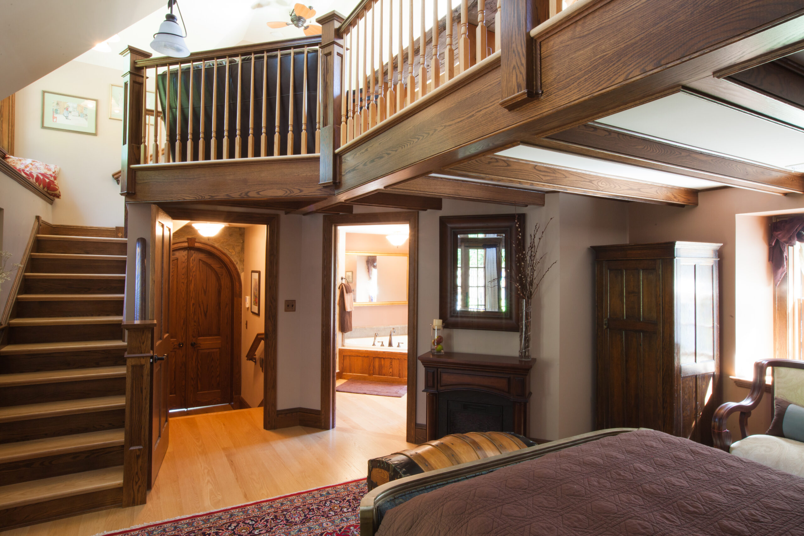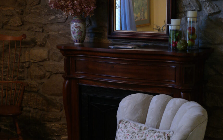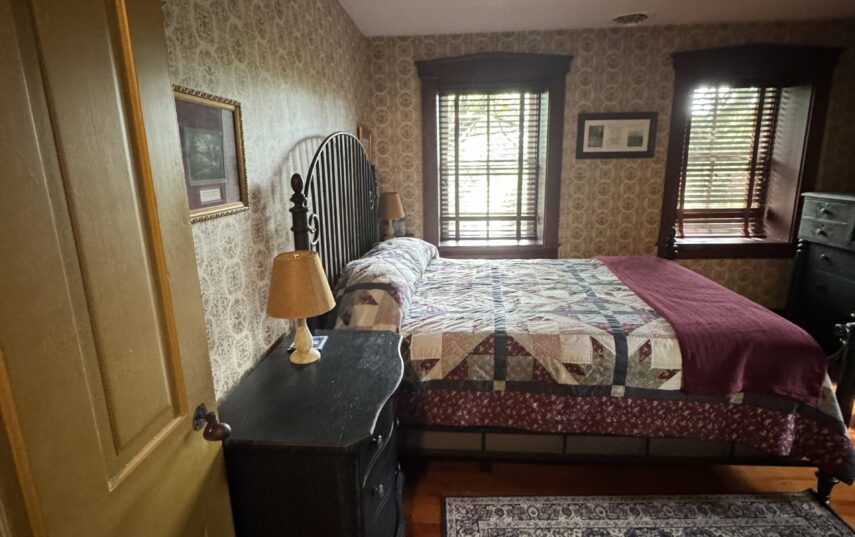 The Windows on the Stream Suite is a double room suite that features a loft bedroom with a Queen size bed and vaulted ceilings, main floor bedroom with a Queen size bed, alcoves, an interior stone wall, and large cozy window seats overlooking the millrace, stream, and upper gardens. The space includes red oak flooring, custom woodwork, couches, and a fireplace. The bedroom offers a hand-carved French Provincial queen-size bed, a wardrobe closet, and an original oriental carpet.