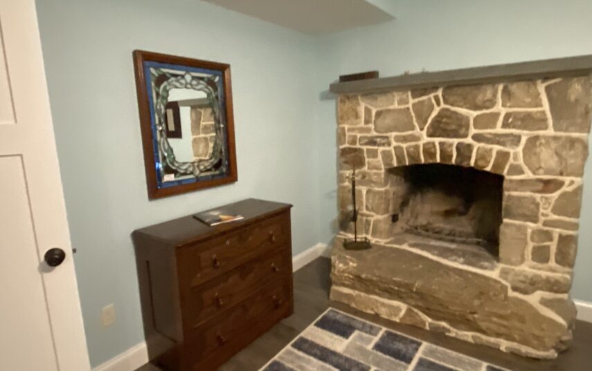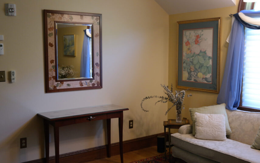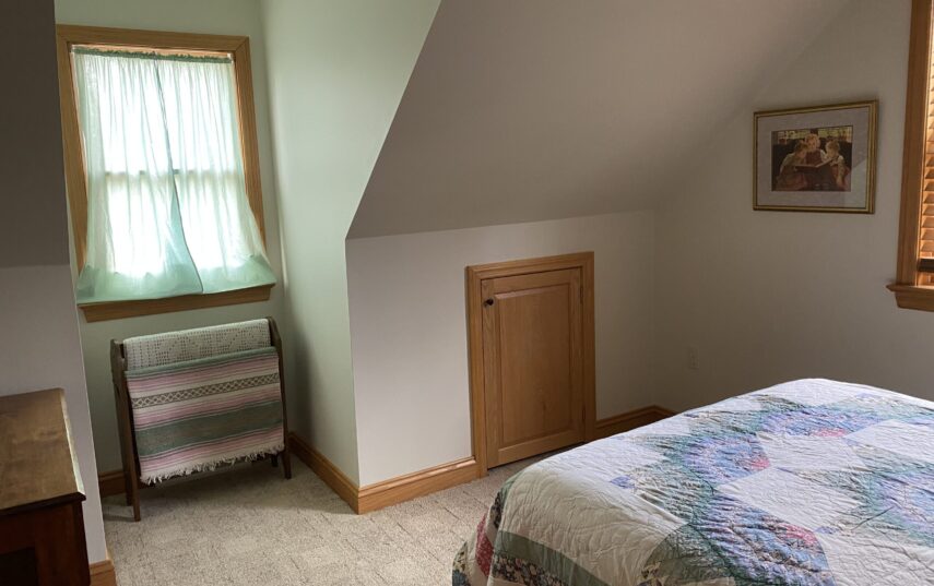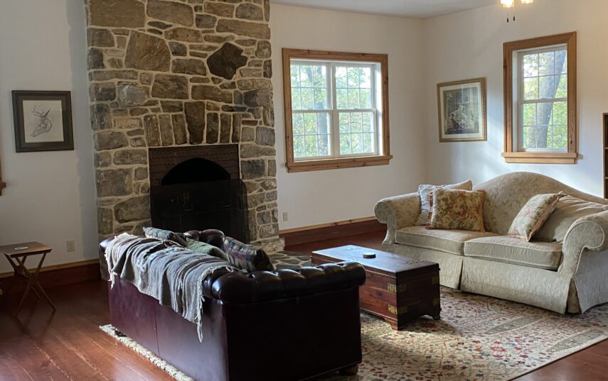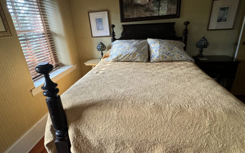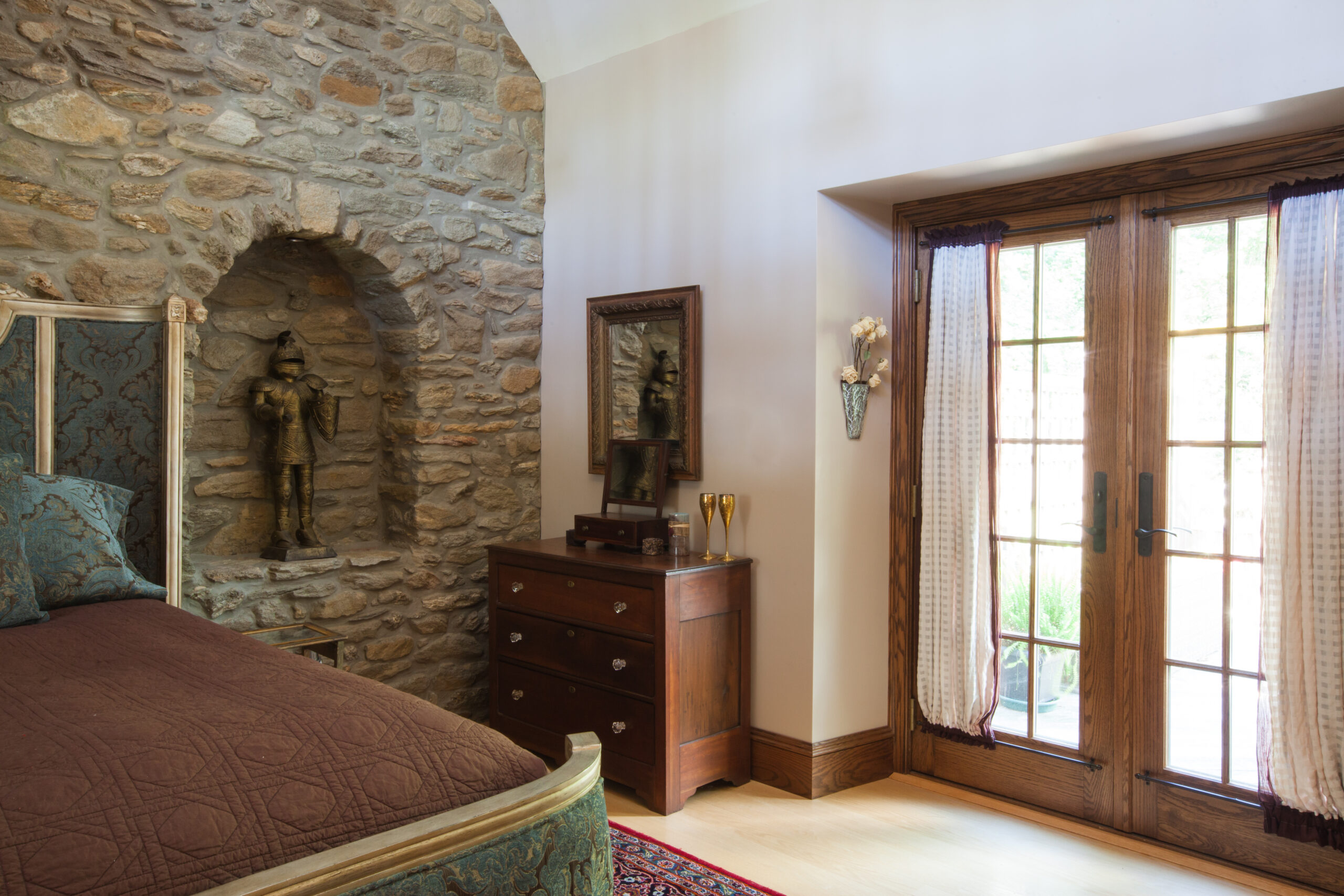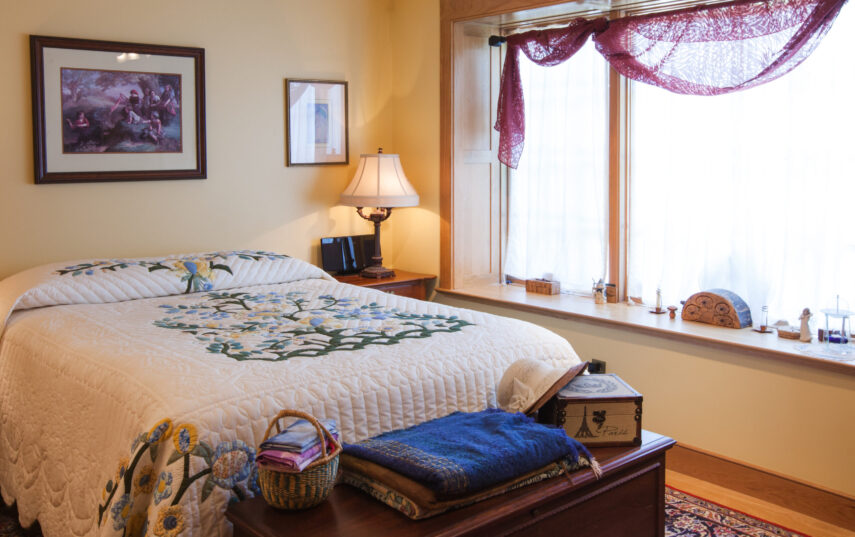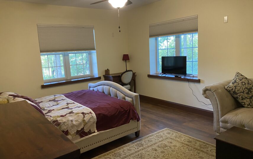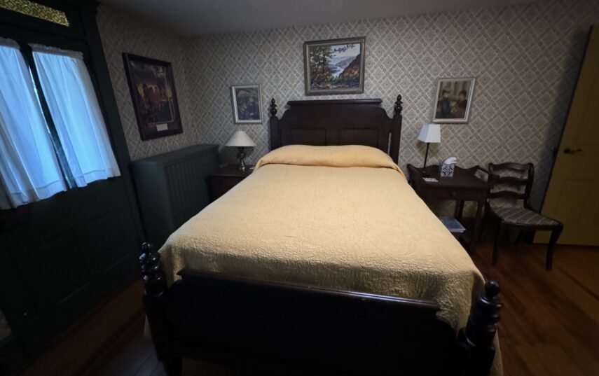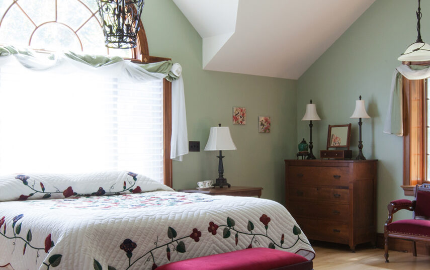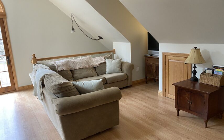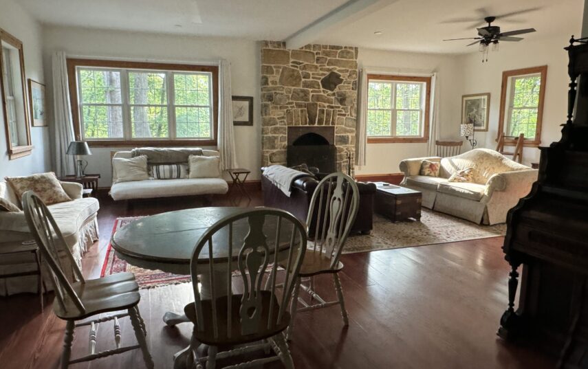 The Windows on the Stream Suite is a double room suite that features a loft bedroom with a Queen size bed and vaulted ceilings, main floor bedroom with a Queen size bed, alcoves, an interior stone wall, and large cozy window seats overlooking the millrace, stream, and upper gardens. The space includes red oak flooring, custom woodwork, couches, and a fireplace. The bedroom offers a hand-carved French Provincial queen-size bed, a wardrobe closet, and an original oriental carpet.