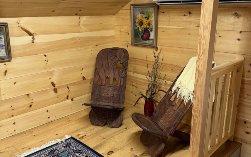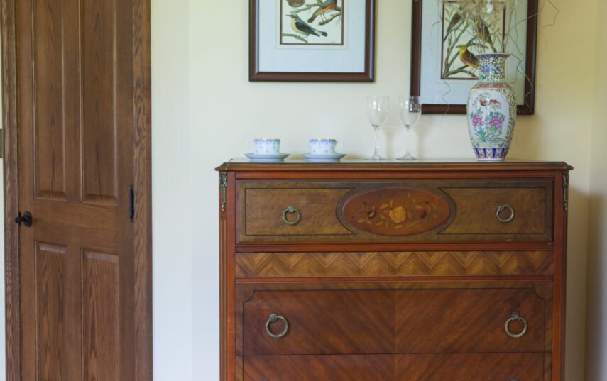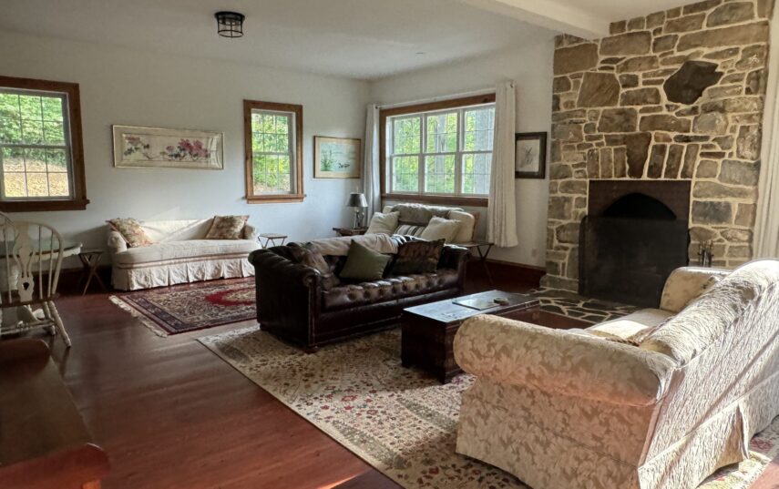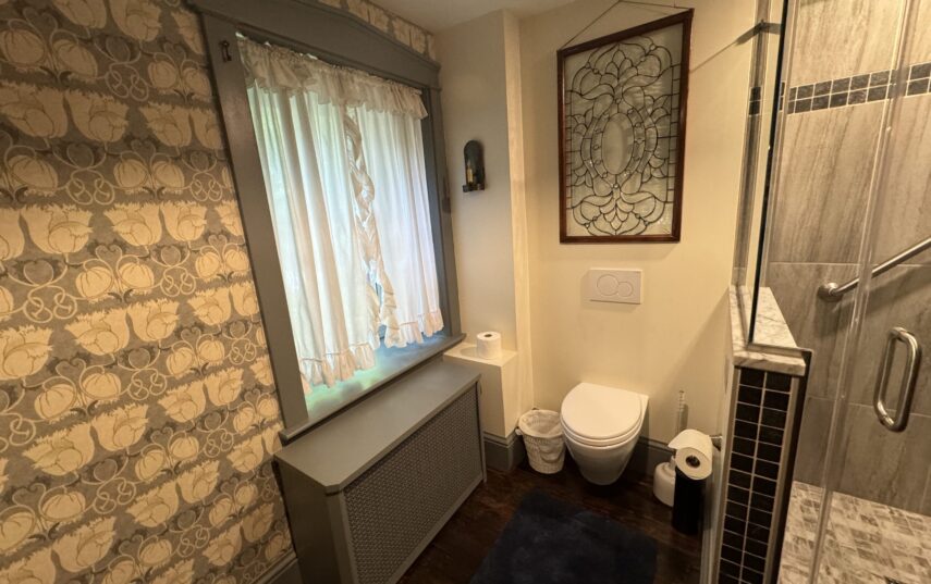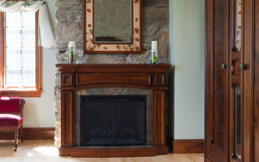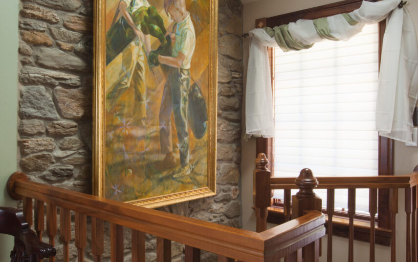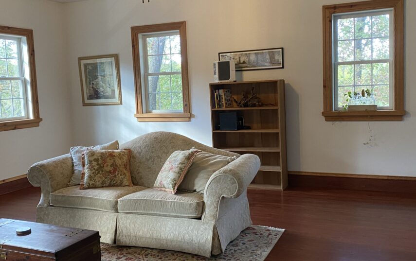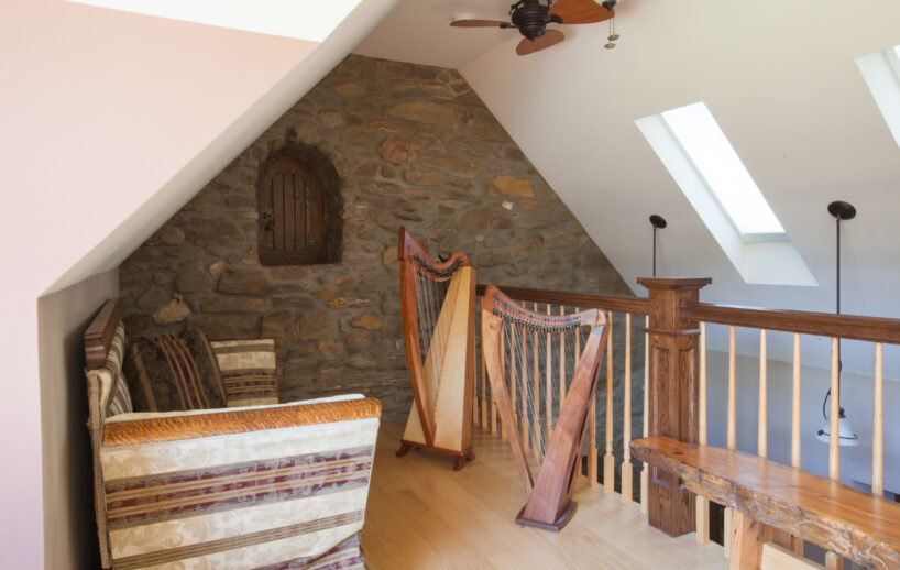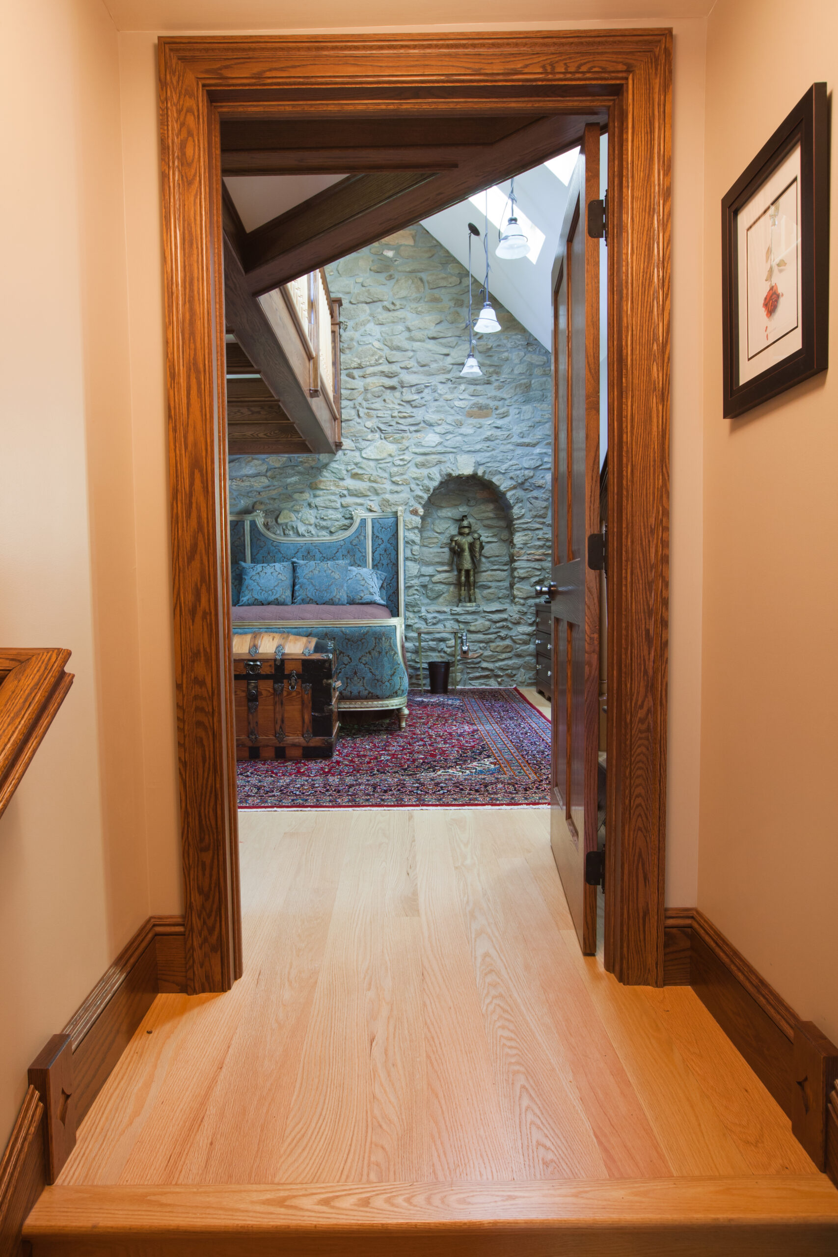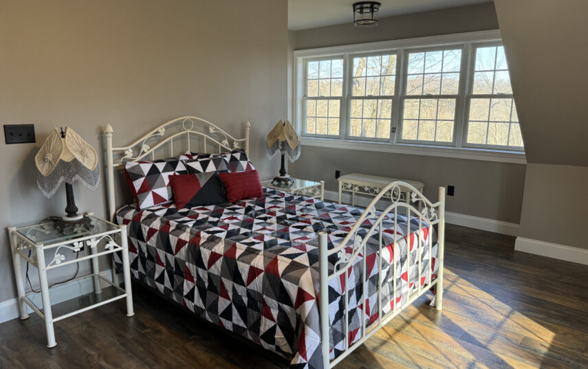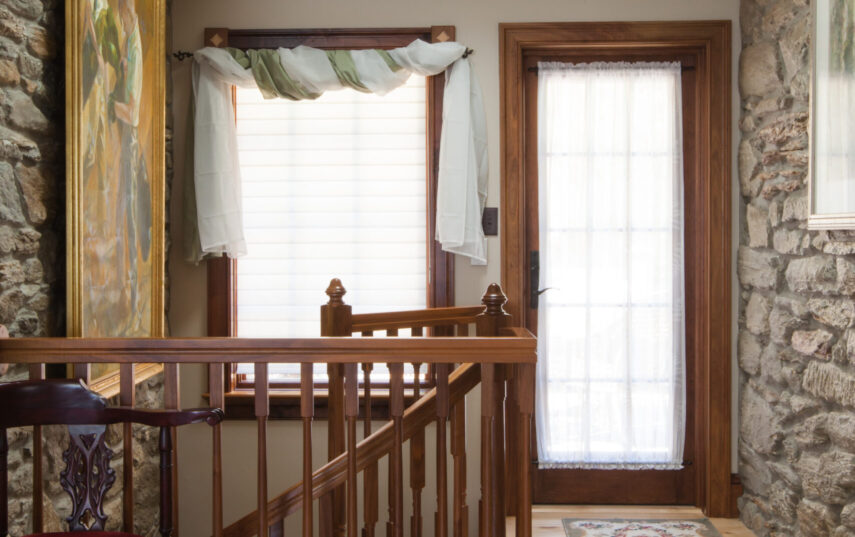 The Windows on the Stream Suite is a double room suite that features a loft bedroom with a Queen size bed and vaulted ceilings, main floor bedroom with a Queen size bed, alcoves, an interior stone wall, and large cozy window seats overlooking the millrace, stream, and upper gardens. The space includes red oak flooring, custom woodwork, couches, and a fireplace. The bedroom offers a hand-carved French Provincial queen-size bed, a wardrobe closet, and an original oriental carpet.