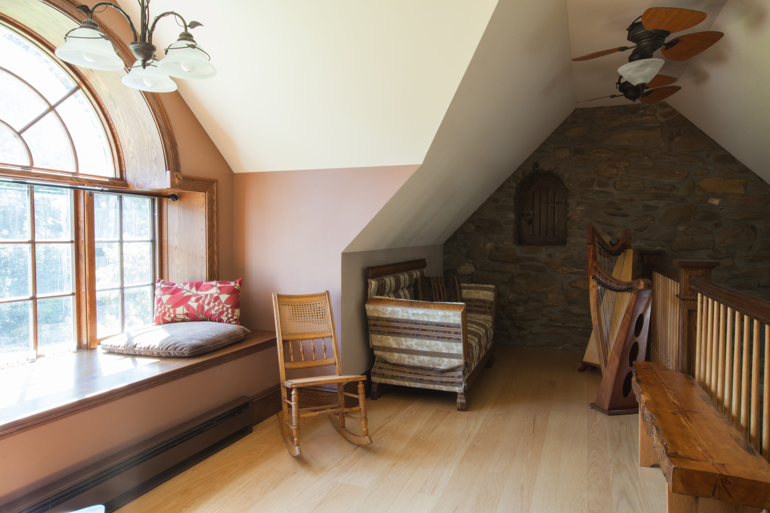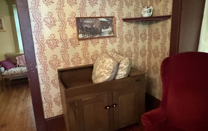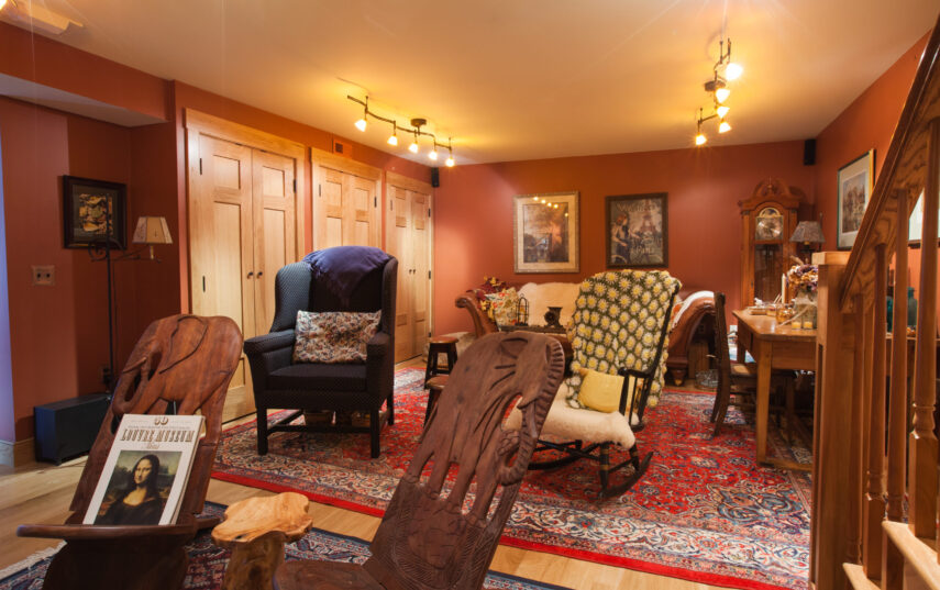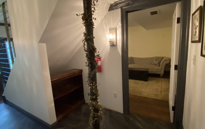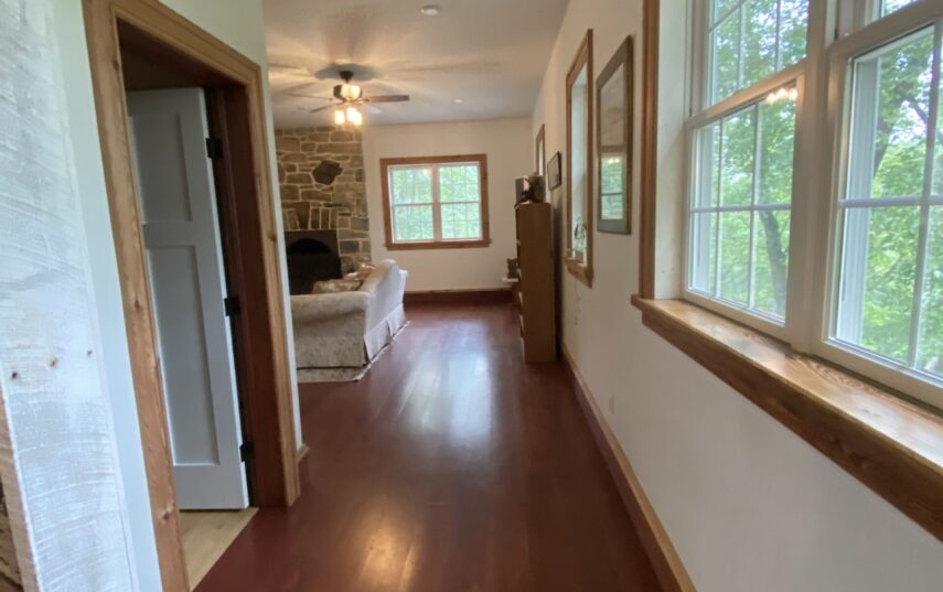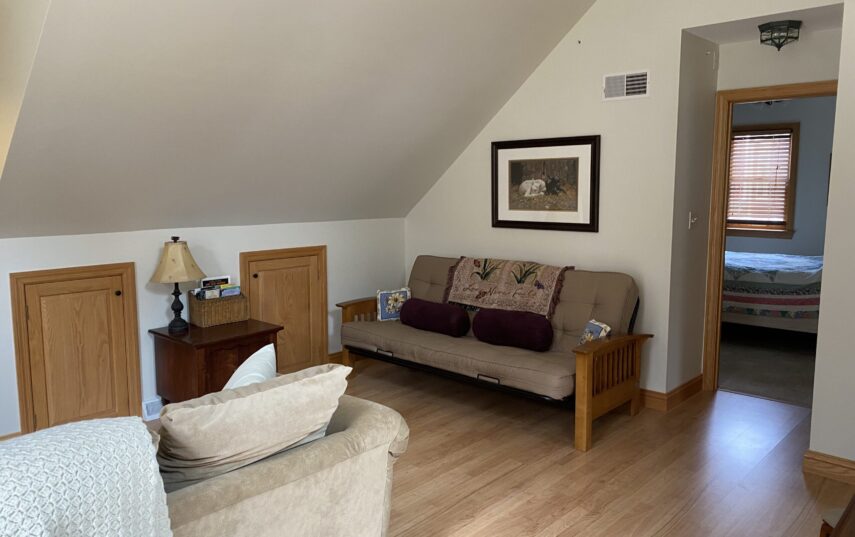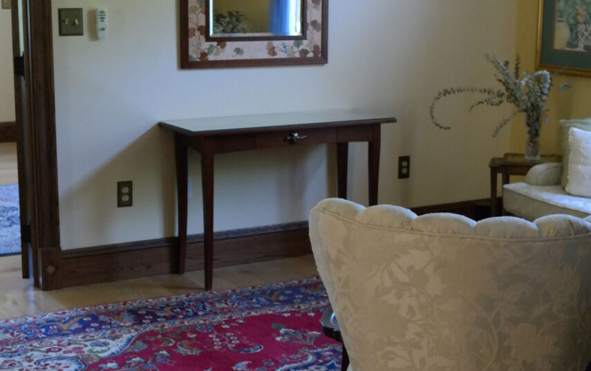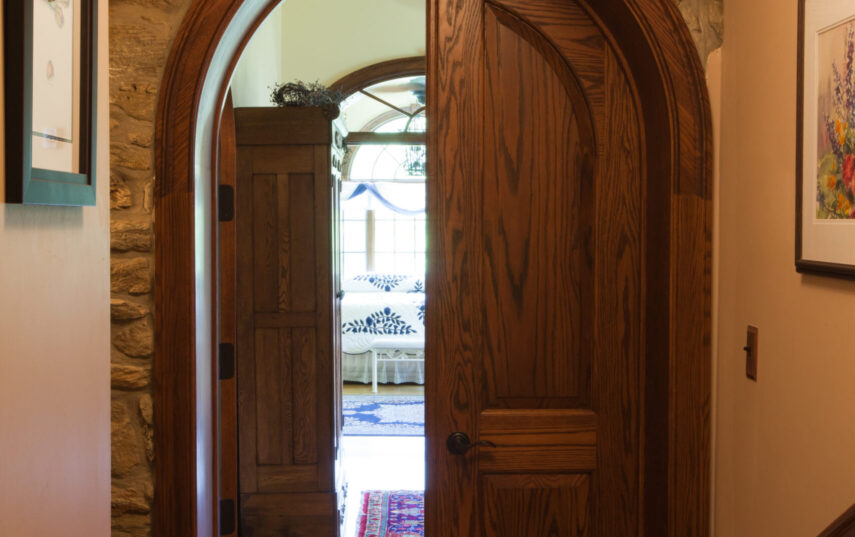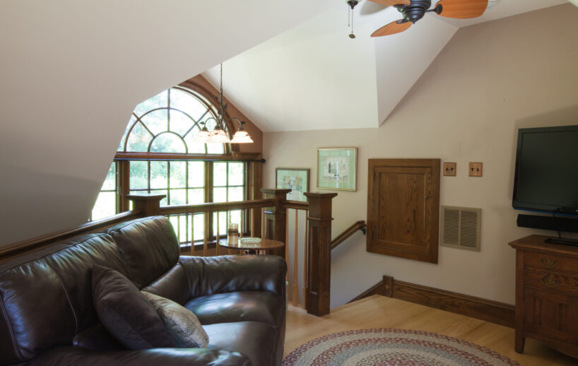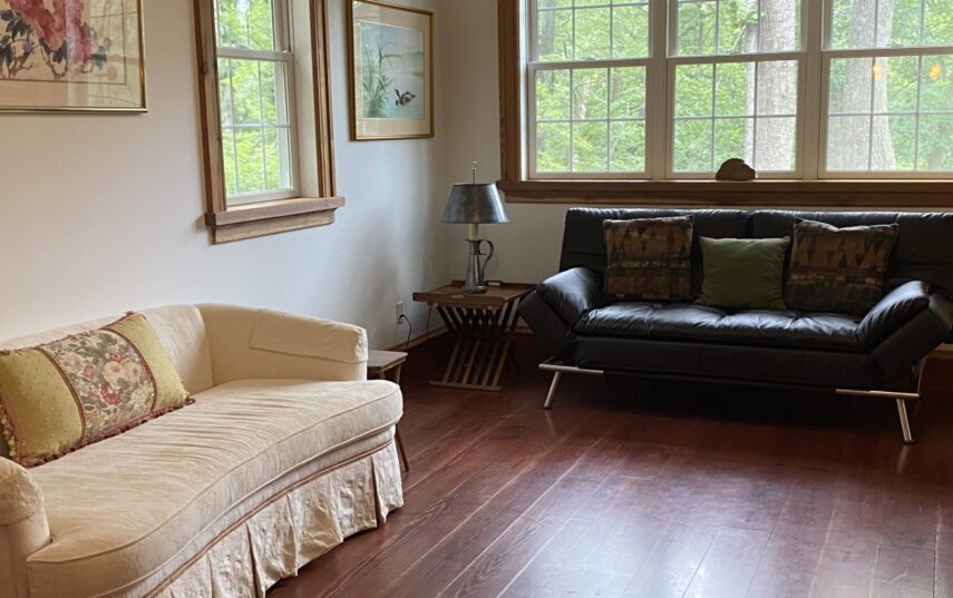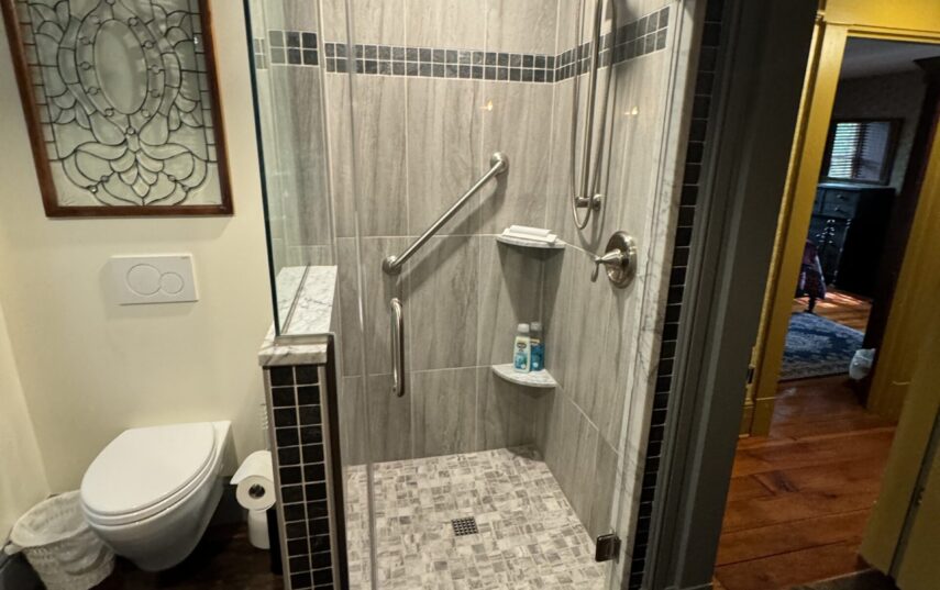 The Windows on the Stream Suite is a double room suite that features a loft bedroom with a Queen size bed and vaulted ceilings, main floor bedroom with a Queen size bed, alcoves, an interior stone wall, and large cozy window seats overlooking the millrace, stream, and upper gardens. The space includes red oak flooring, custom woodwork, couches, and a fireplace. The bedroom offers a hand-carved French Provincial queen-size bed, a wardrobe closet, and an original oriental carpet.
