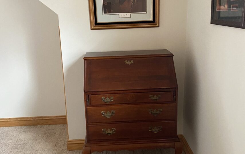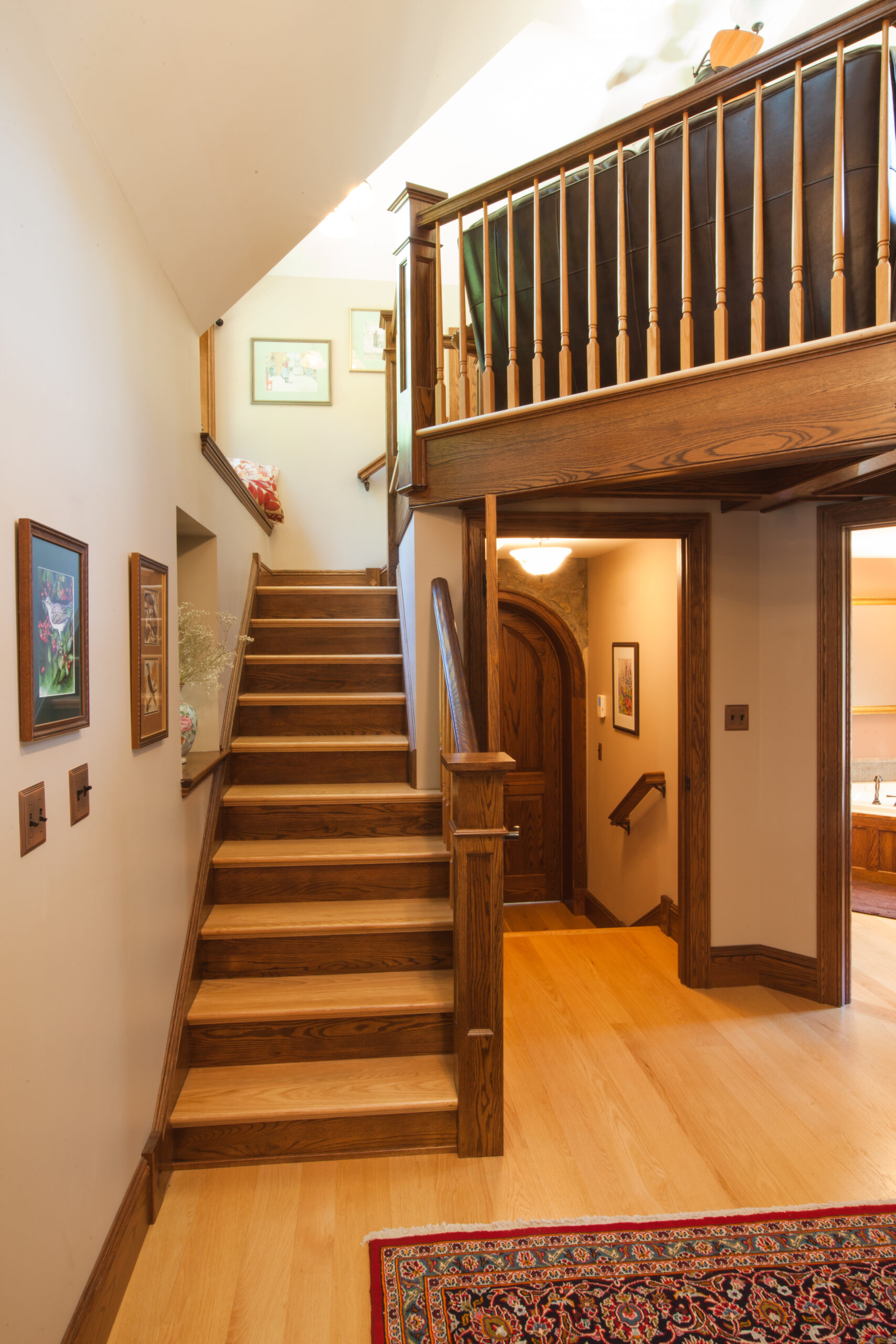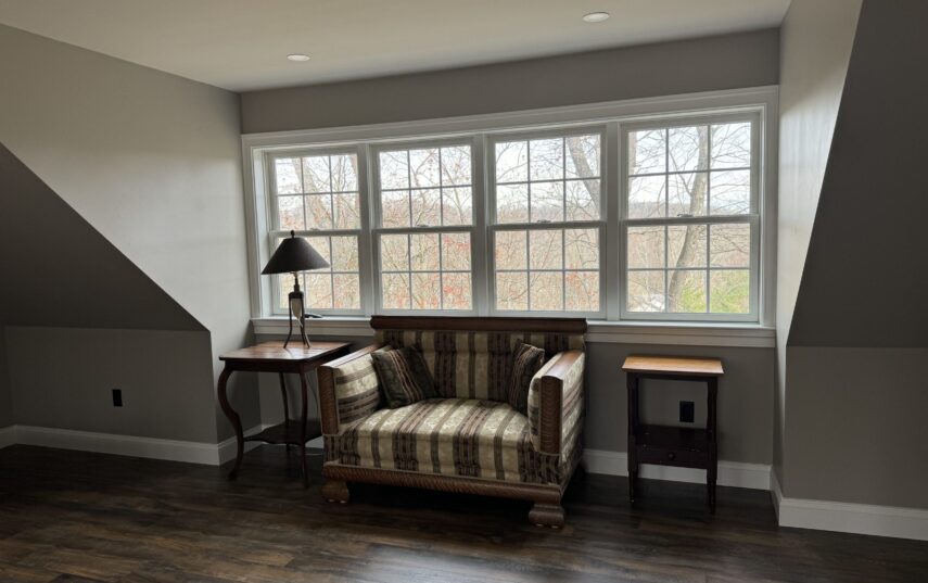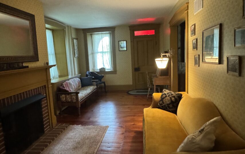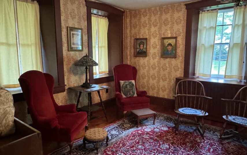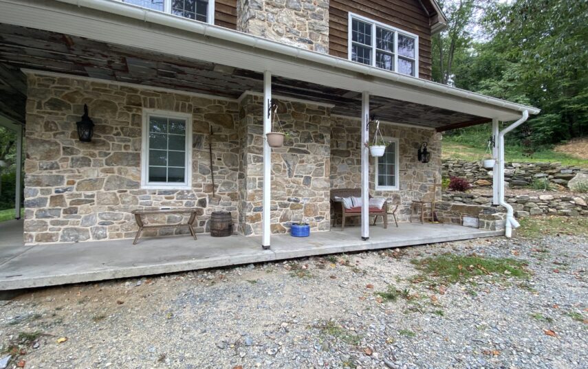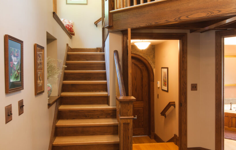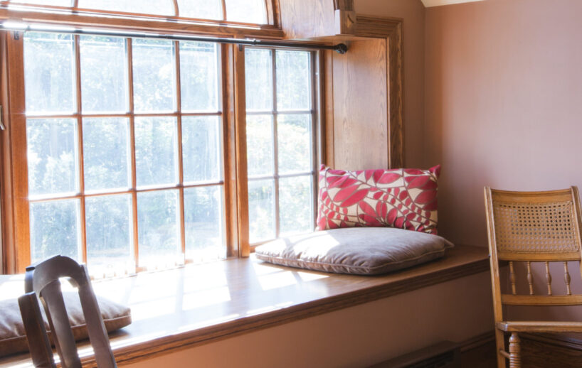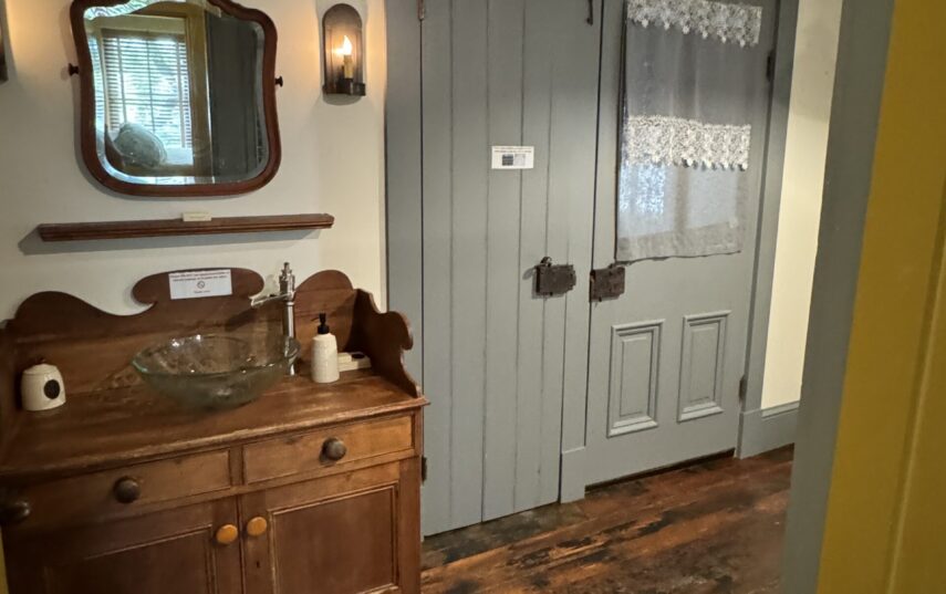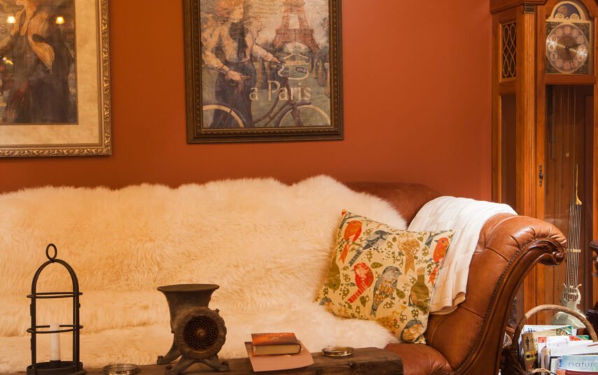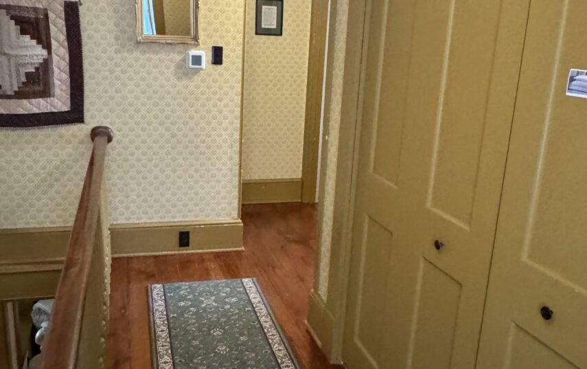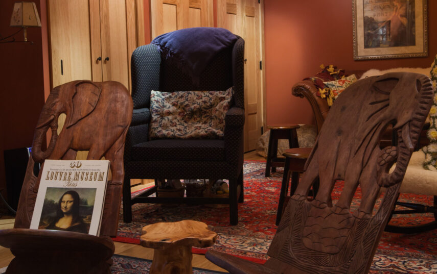 The Windows on the Stream Suite is a double room suite that features a loft bedroom with a Queen size bed and vaulted ceilings, main floor bedroom with a Queen size bed, alcoves, an interior stone wall, and large cozy window seats overlooking the millrace, stream, and upper gardens. The space includes red oak flooring, custom woodwork, couches, and a fireplace. The bedroom offers a hand-carved French Provincial queen-size bed, a wardrobe closet, and an original oriental carpet.