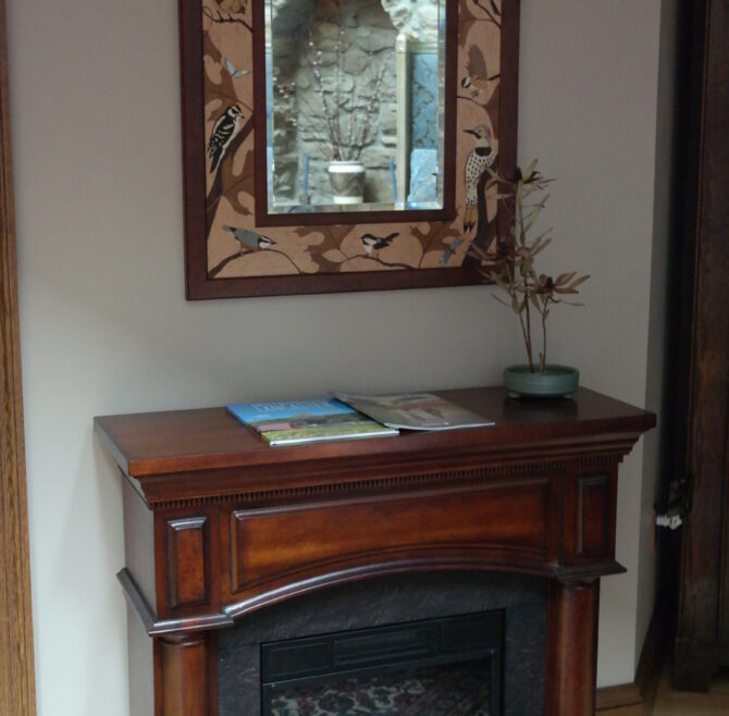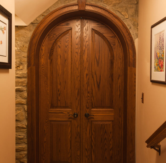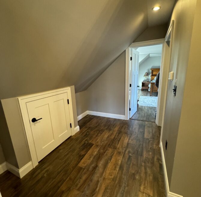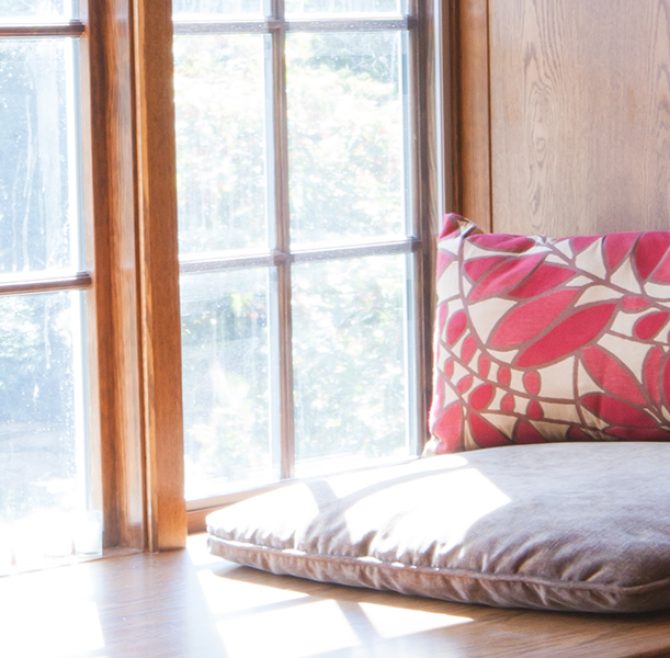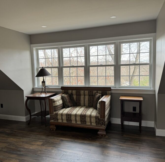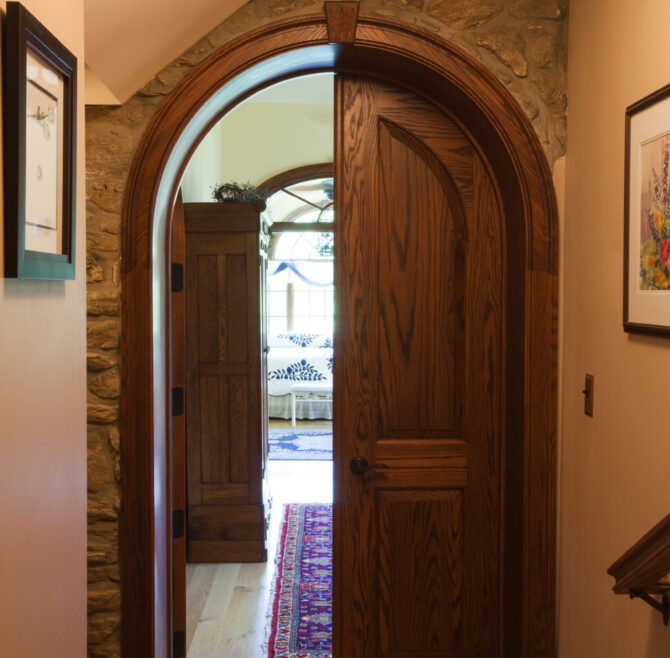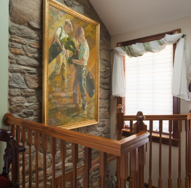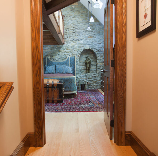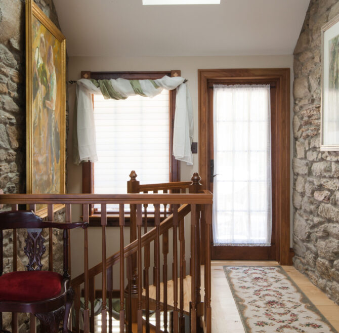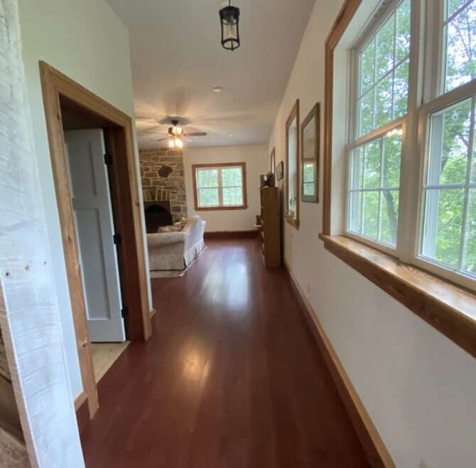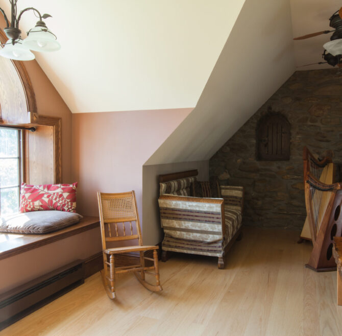 Interior stone wall, vaulted ceiling, alcoves, red oak flooring and woodwork, loft living room with large cozy window seats, original oriental carpet