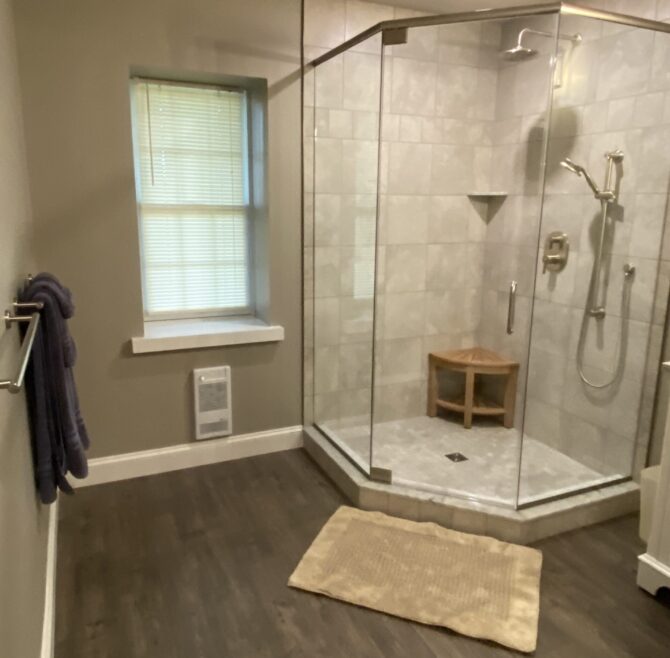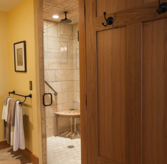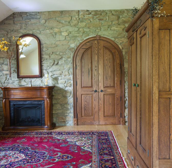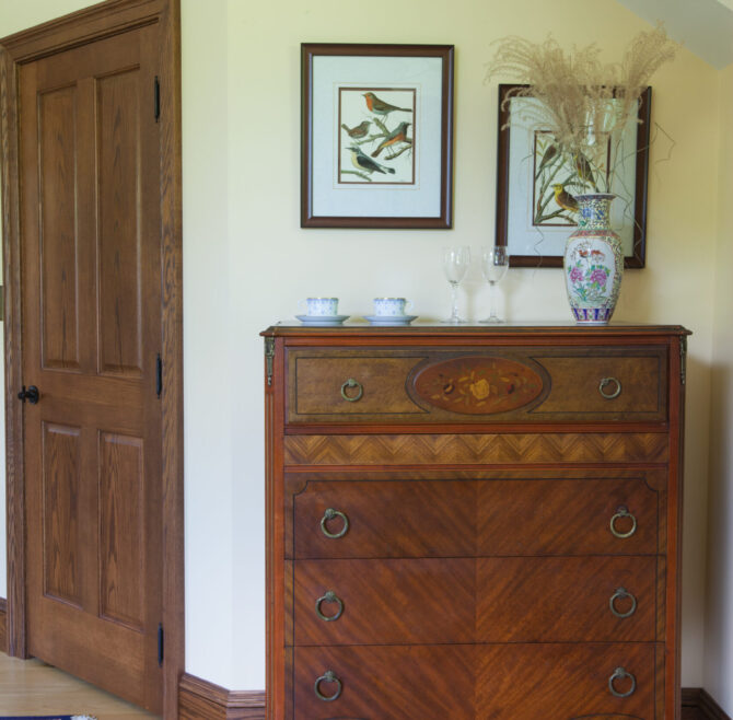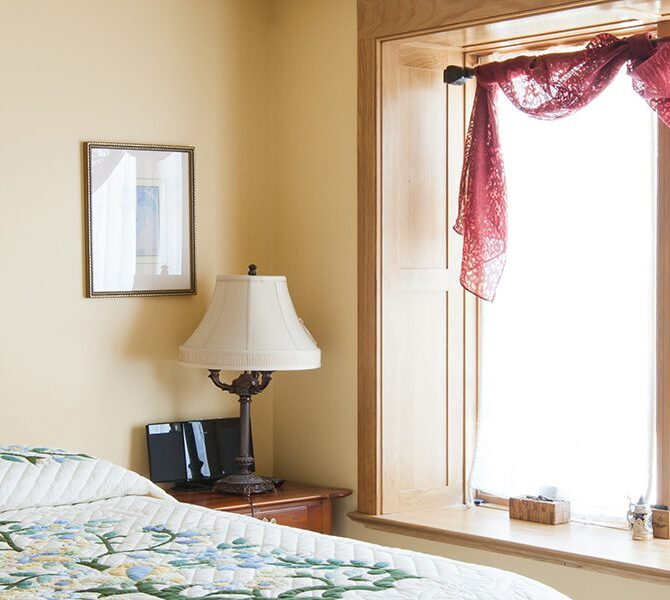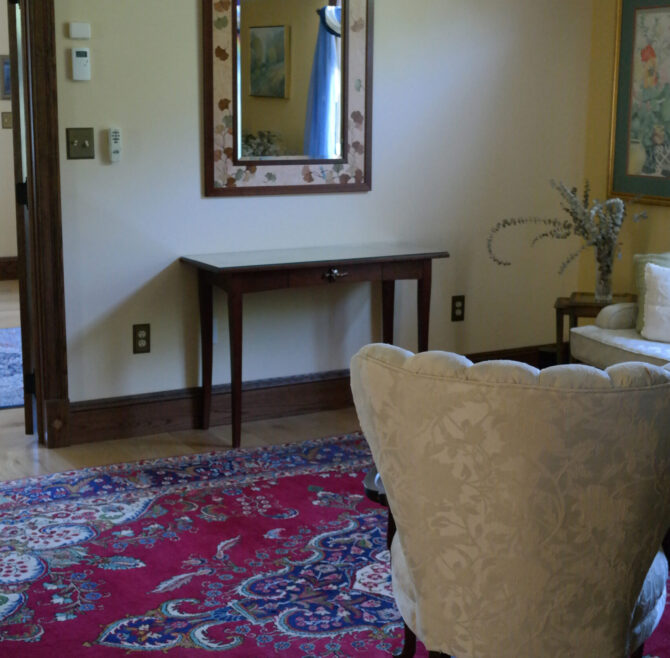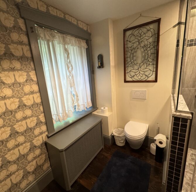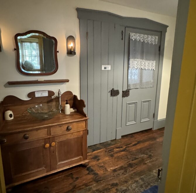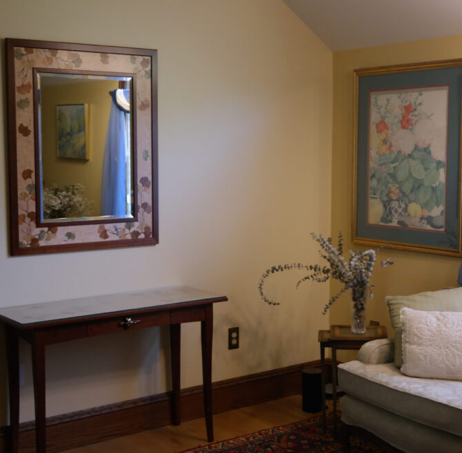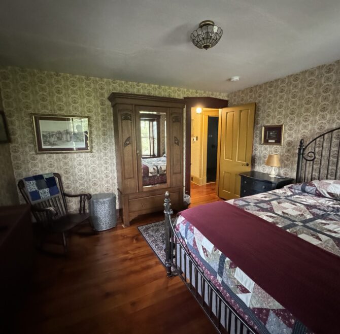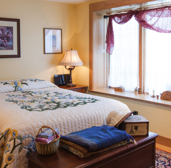 Handicap Accessible garden-level suite, large picture window overlooking patio and secret garden, oak flooring and woodwork, Meon I-Digital performance shower, roll-in wheelchair accessible, antique walnut wardrobe, adjoining kitchen available for accessible dining service.