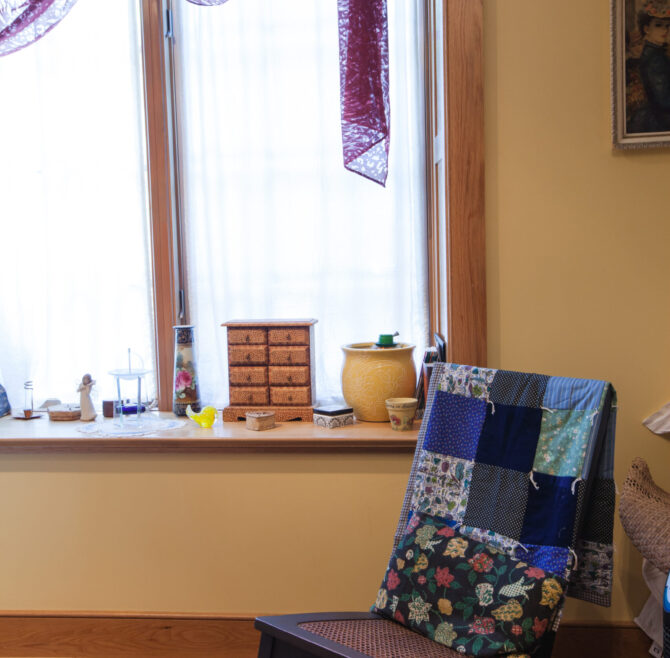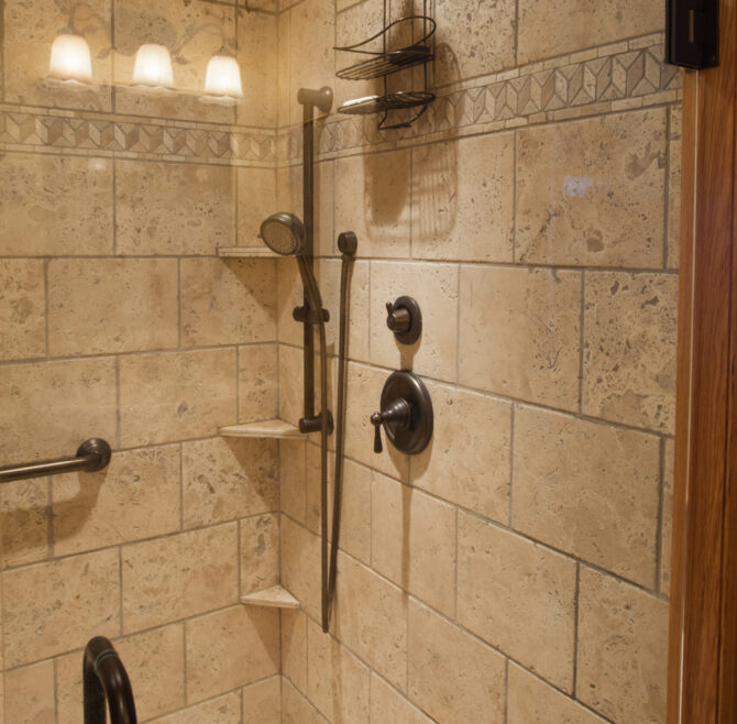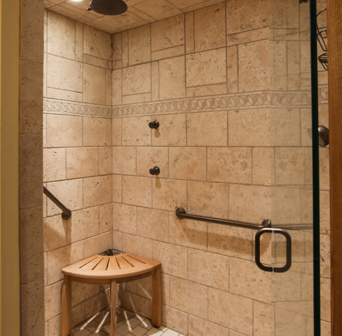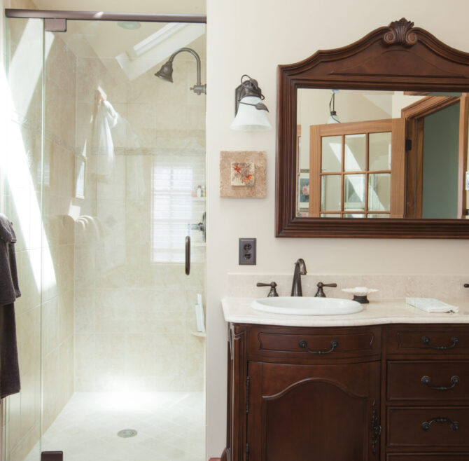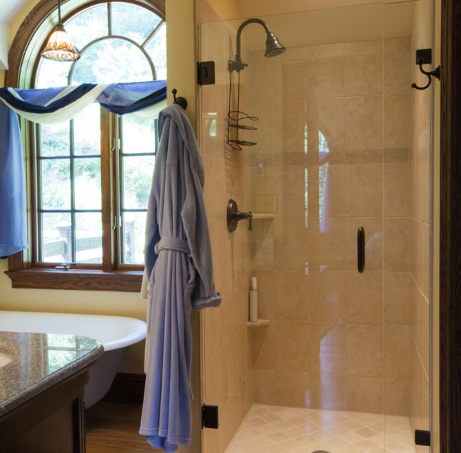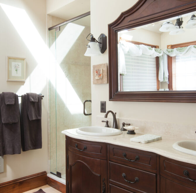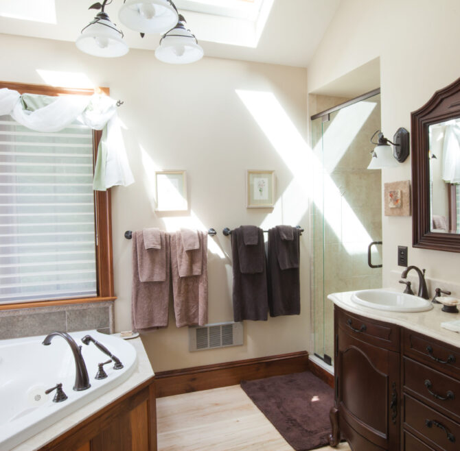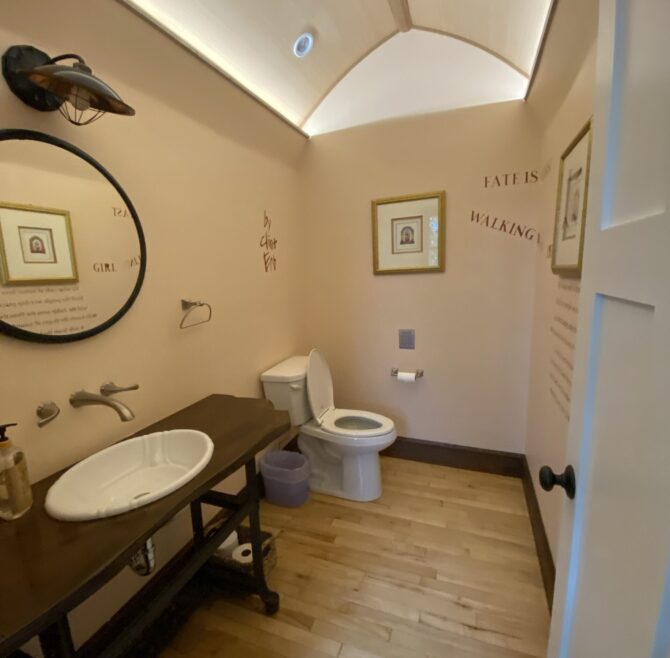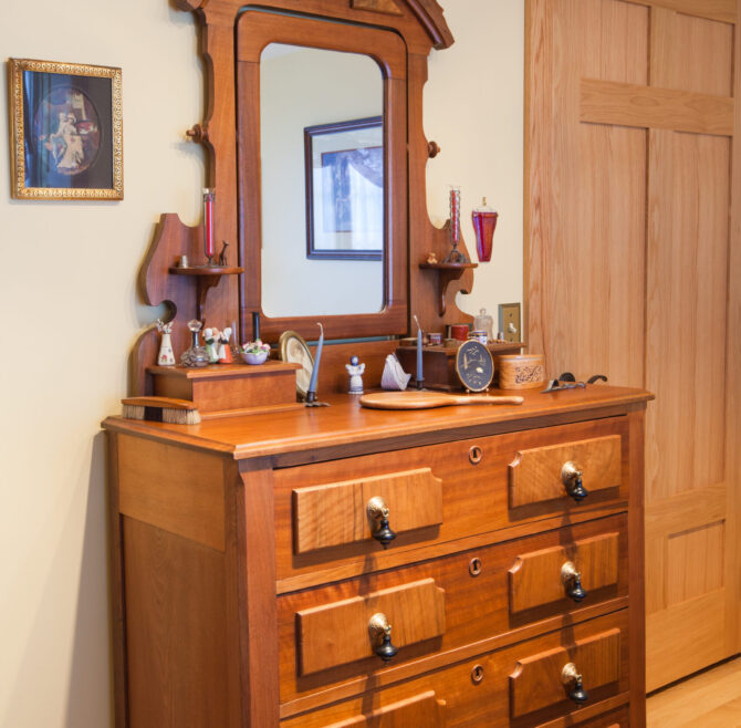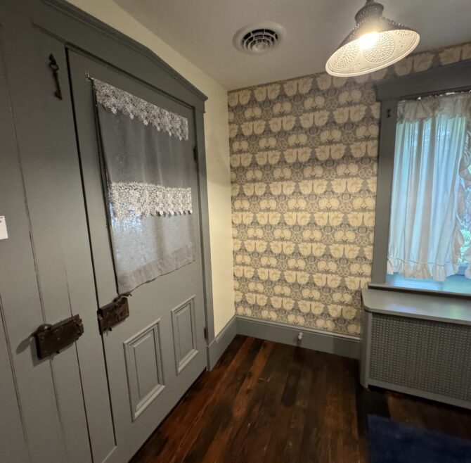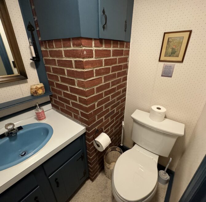 Handicap Accessible garden-level suite, large picture window overlooking patio and secret garden, oak flooring and woodwork, Meon I-Digital performance shower, roll-in wheelchair accessible, antique walnut wardrobe, adjoining kitchen available for accessible dining service.