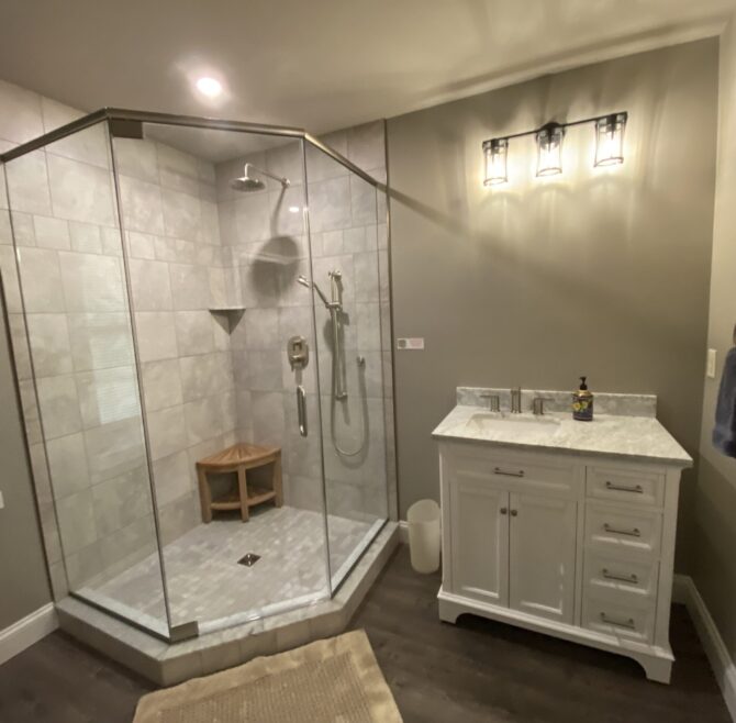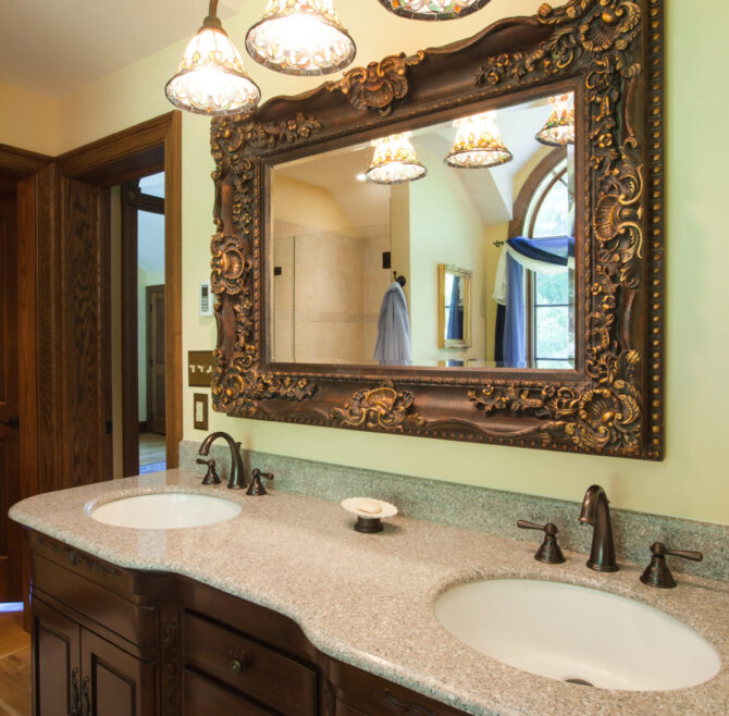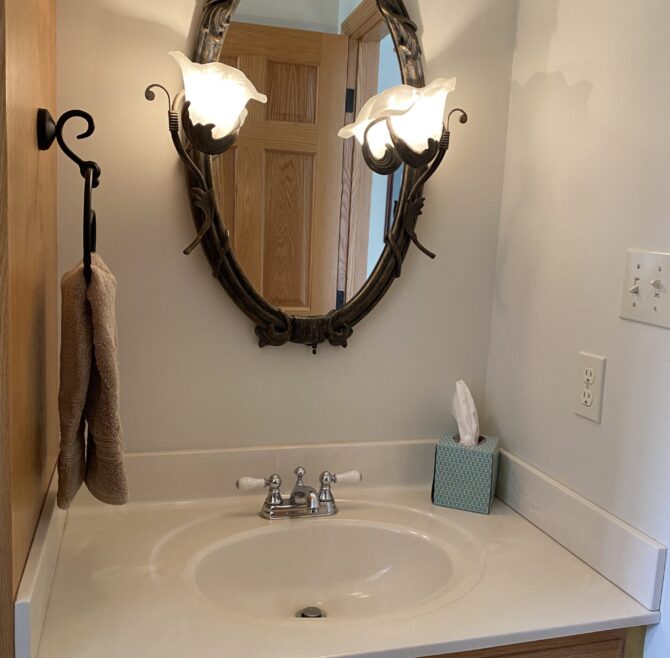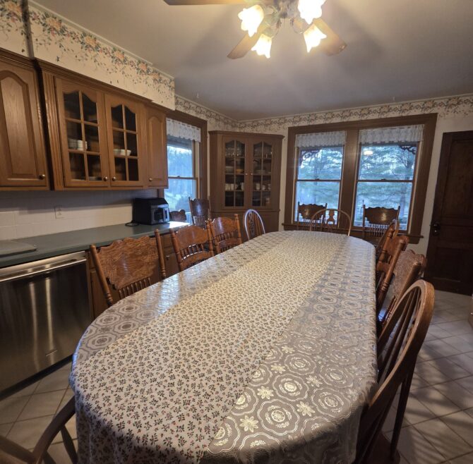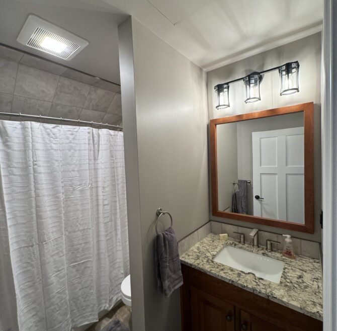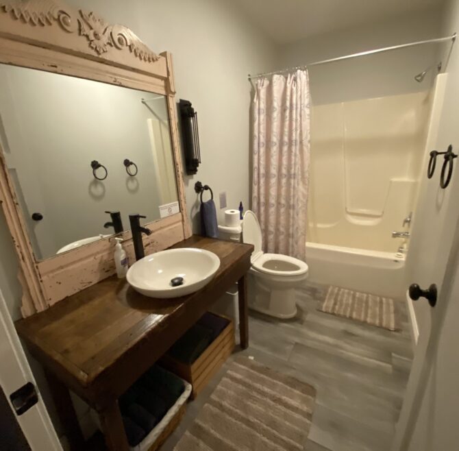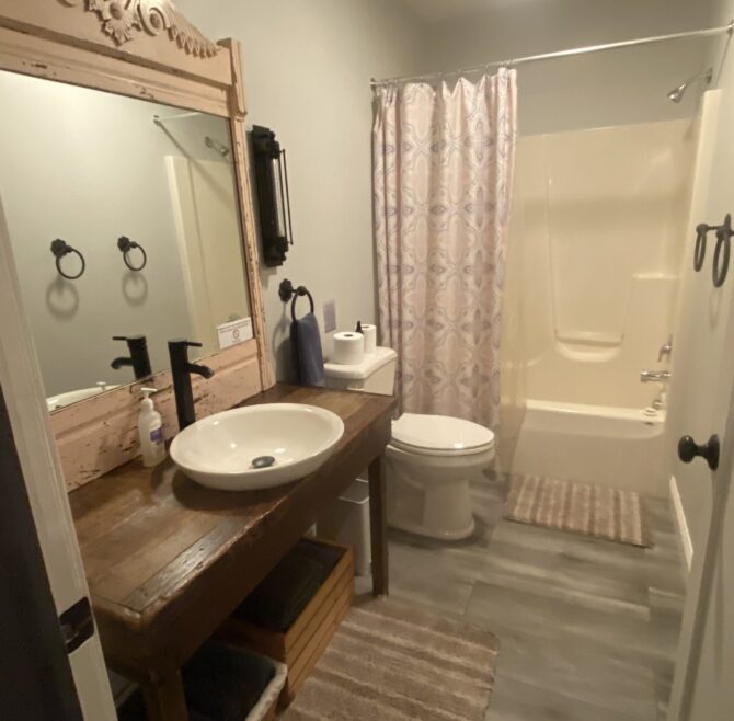 Beautiful appliquéd Amish quilt, four beautiful circle top windows, large ornate mirror over double bowl sink, large claw-foot tub and shower, entertainment area